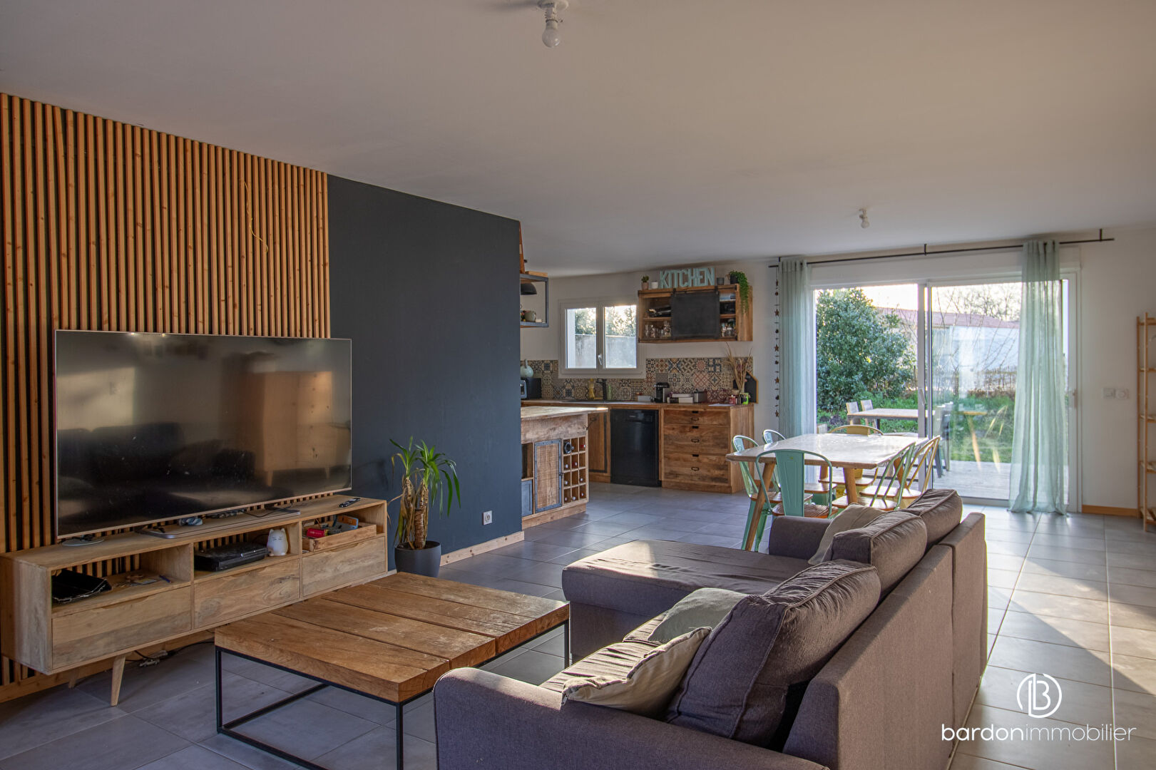 Elle offre une entrée donnant sur une pièce de vie comprenant un salon, une salle à manger, une cuisine a...