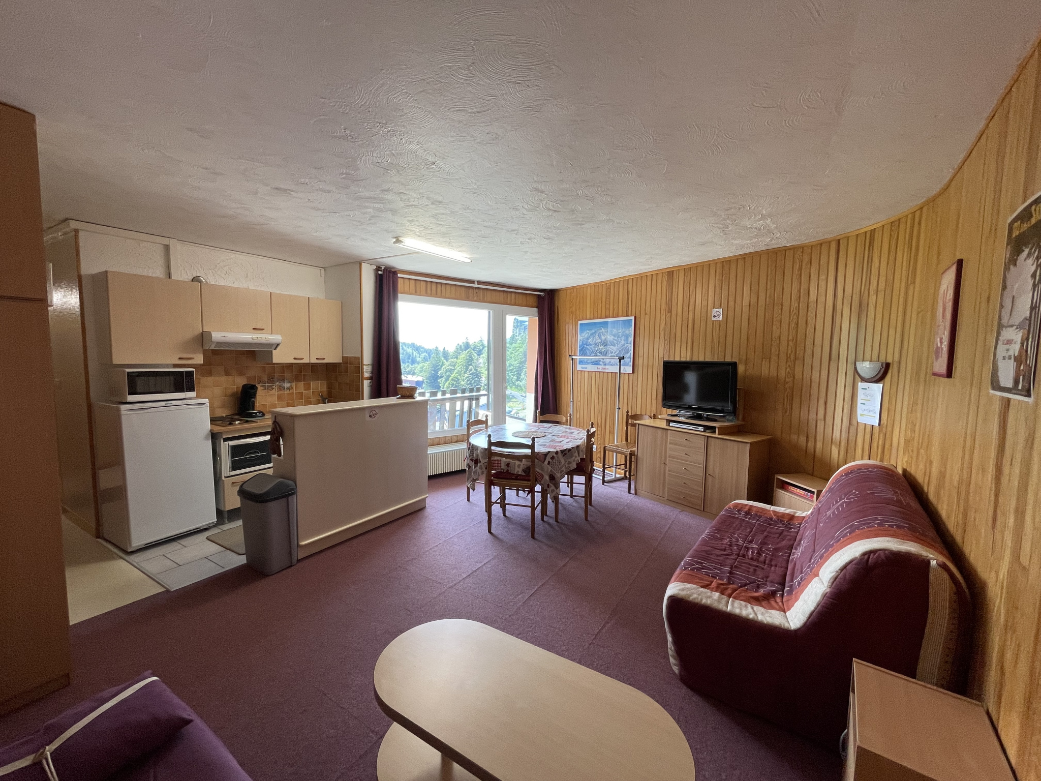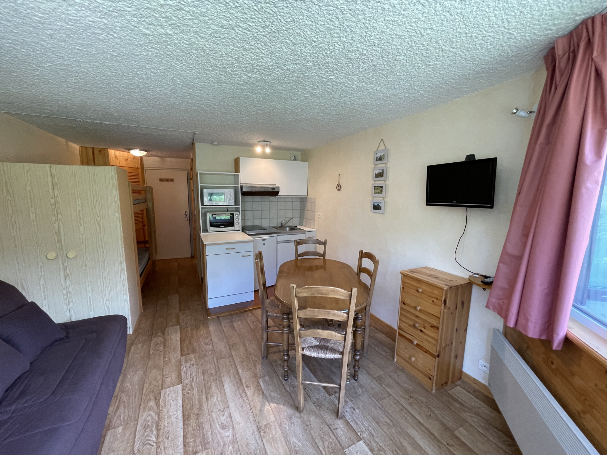 Studio en centre station composé d'une entrée avec cuisine équipée, placard, salle d'eau avec baignoire et Wc et d'une pièce de vie lumineuse. Jolie vue sur la montagne.