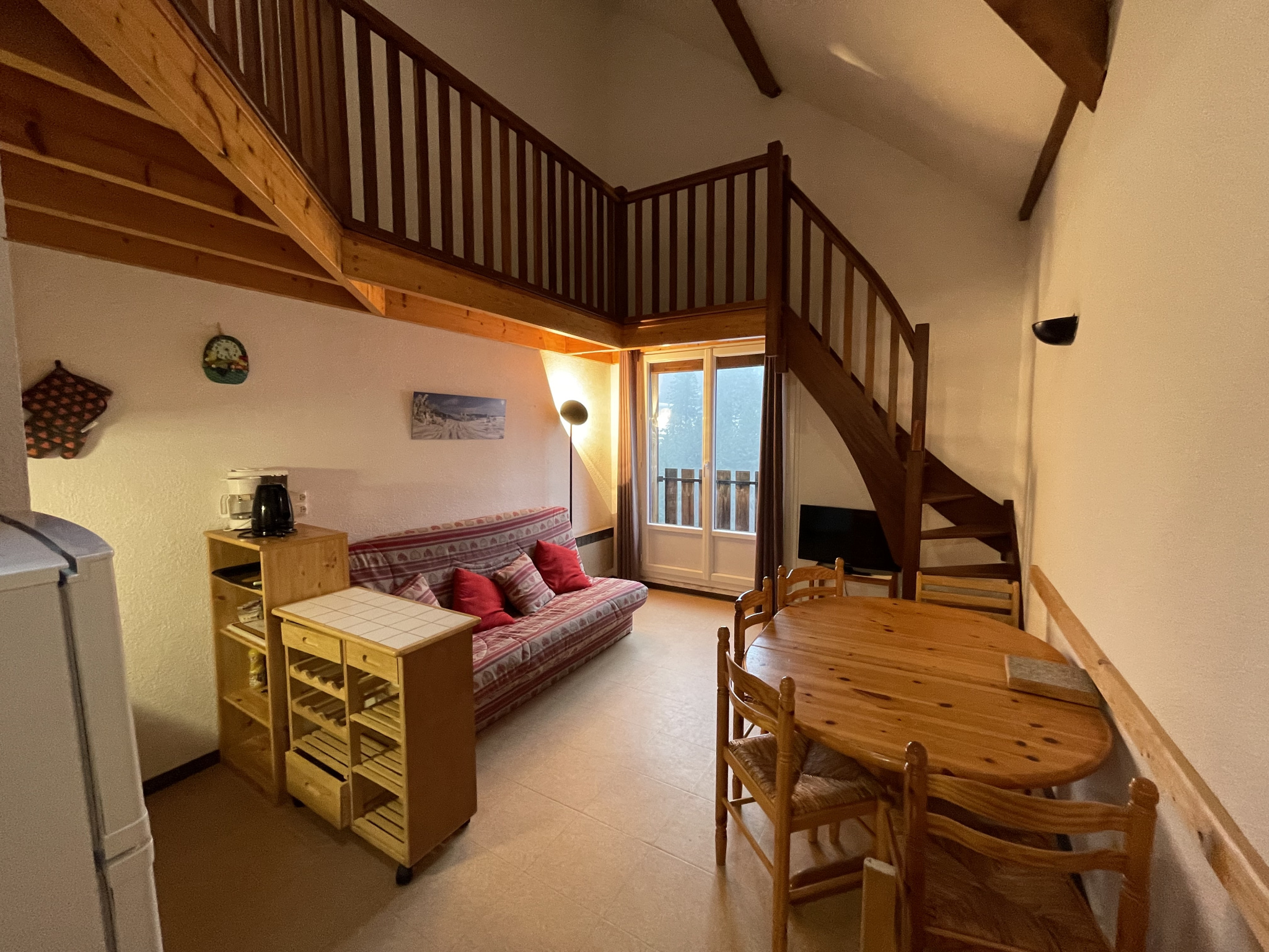 Ce joli studio cabine mezzanine situé dans la résidence Les Portes du Sud ,secteur Font d'Alagnon, est composé d'une entrée avec un lit simple en coin cabine, salle d'eau et WC indépendant, un séjour lumineux composé du coin cuisine et coin salo...