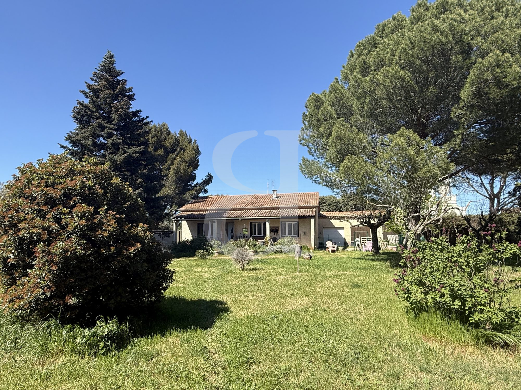 A l'extérieur de la ville, maison de plain pied avec son double garage sur un terrain paysagé de 2...
