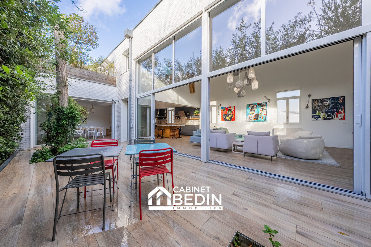 Maison art déco, 4 chambres, bureau, garage . Charmante maison familiale située proche de la Barrière de Pessac, dans une rue calme. <BR>Au rez-de-chaussée, elle propose un grand séjour-salle à manger, une cuisine ouvrant sur la véranda et un jardin de 6...