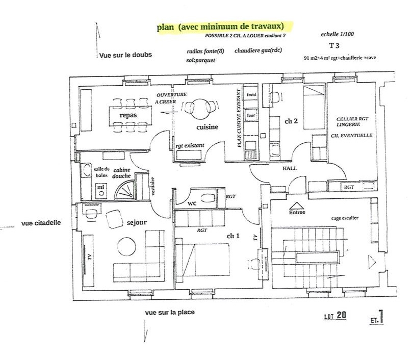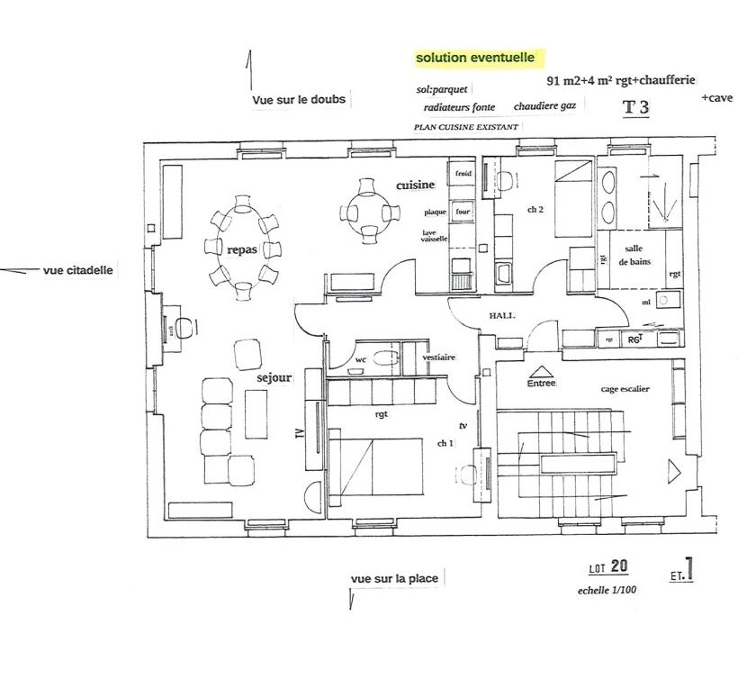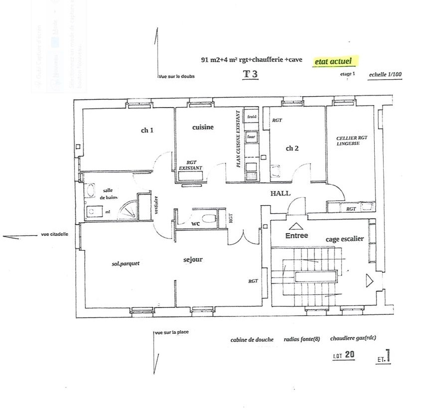 Haut de Battant - Bel appartement T3 de 70 m² au 1er étage, traversant entre deux cours - se compose d'une entrée sur cuisine meublée où l'on peu manger, un salon, deux chambres sdb et wc séparés - cave en sous-sol - des travaux de rafraîchissements ...