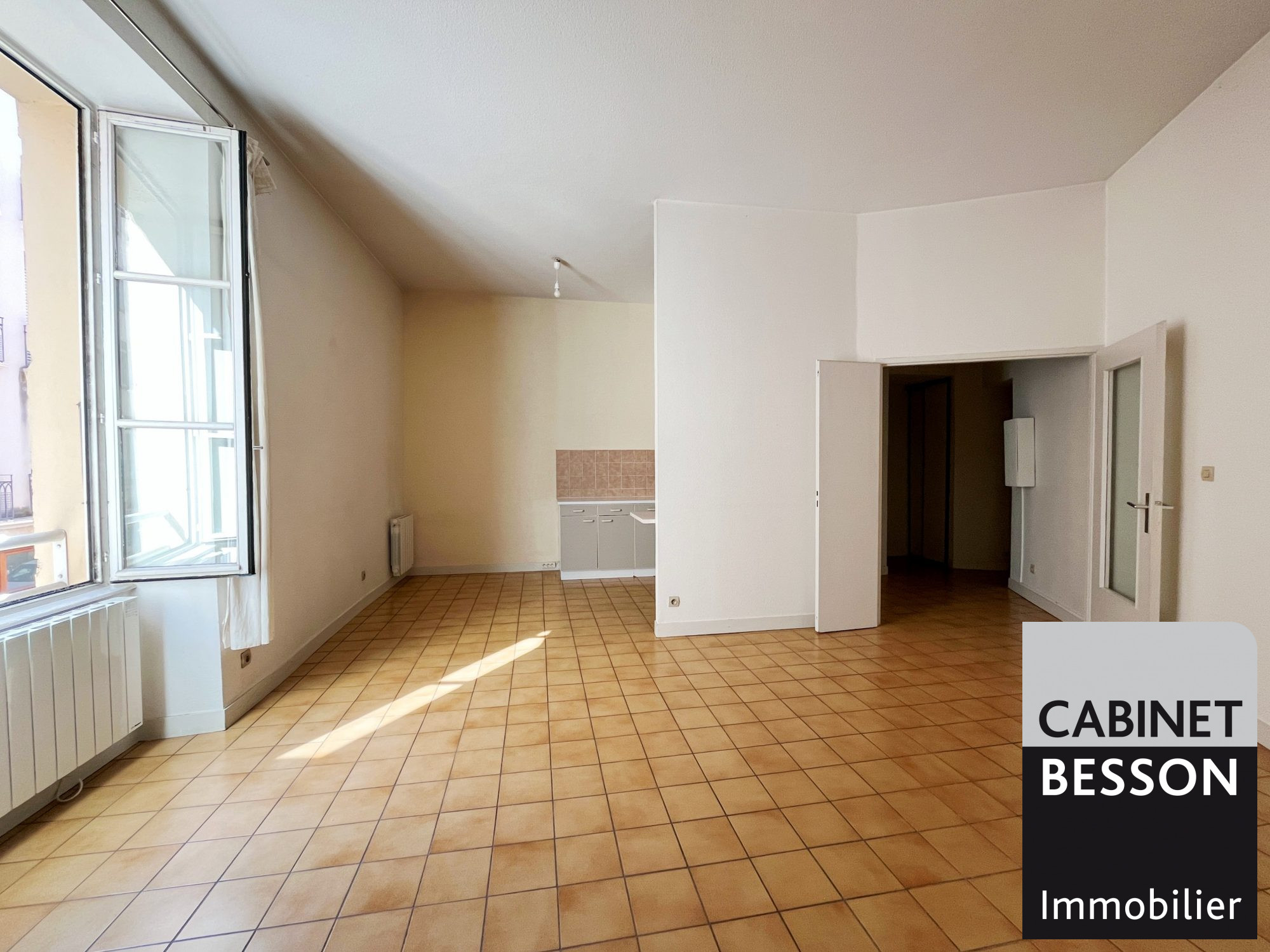 Au 4ème et dernier étage sans ascenseur, T3 de 61m² comprenant un séjour et une cuisine aménagée donnant sur un balcon de 9m² à l'Est, sans vis à vis, 2 chambres, cellier, salle de bains et wc.