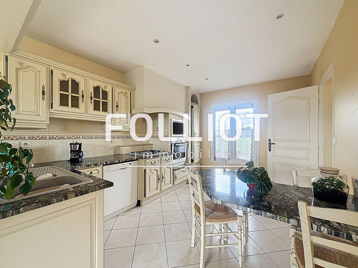 Elle se compose d'un salon avec cheminée, d'un séjour, d'une cuisine avec arrière-cuisine, de quatre chambres ...