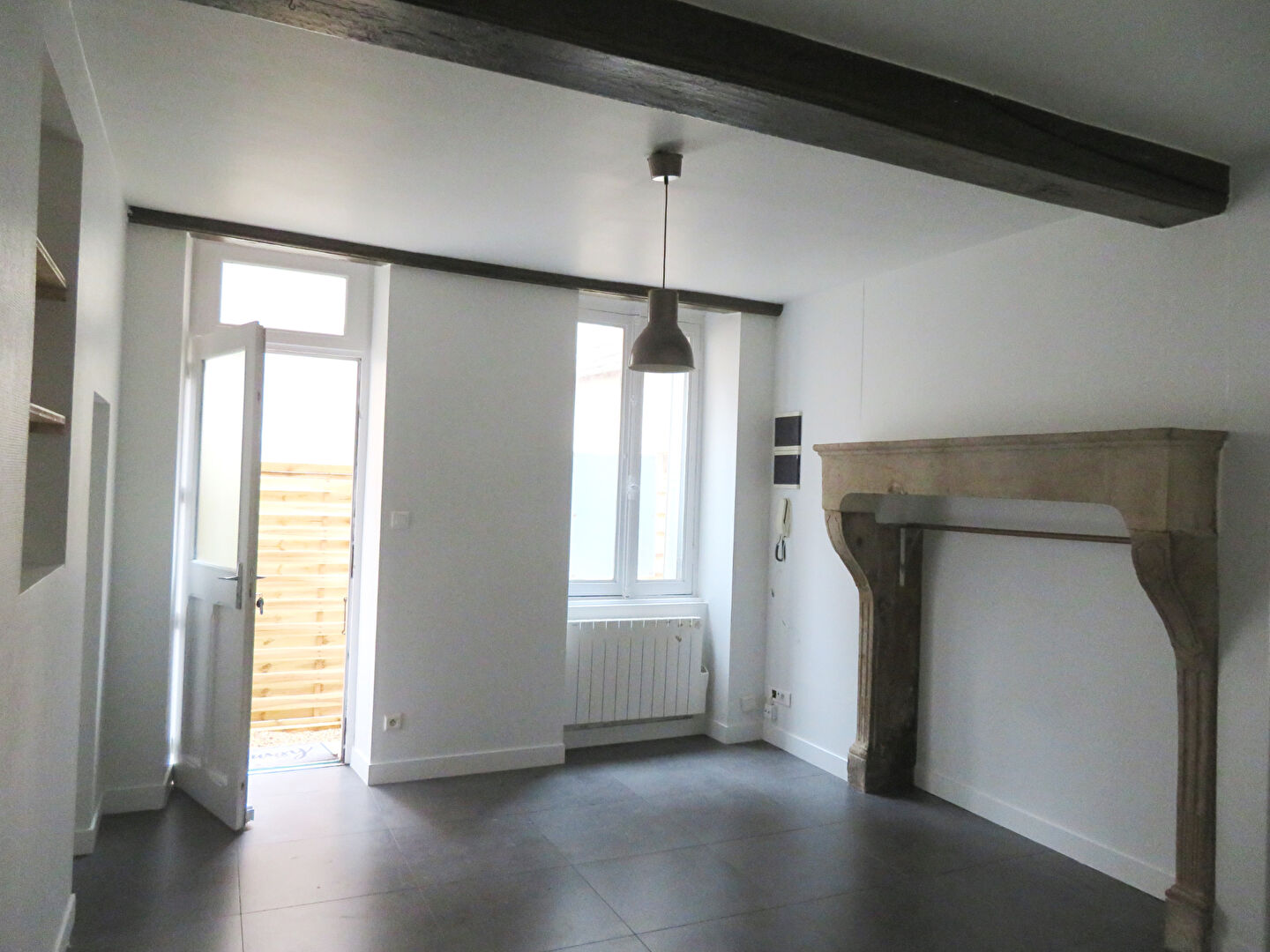 Entrée dans pièce principale avec cheminée, espace cuisine séparé petite fenêtre. Salle d'eau, wc.