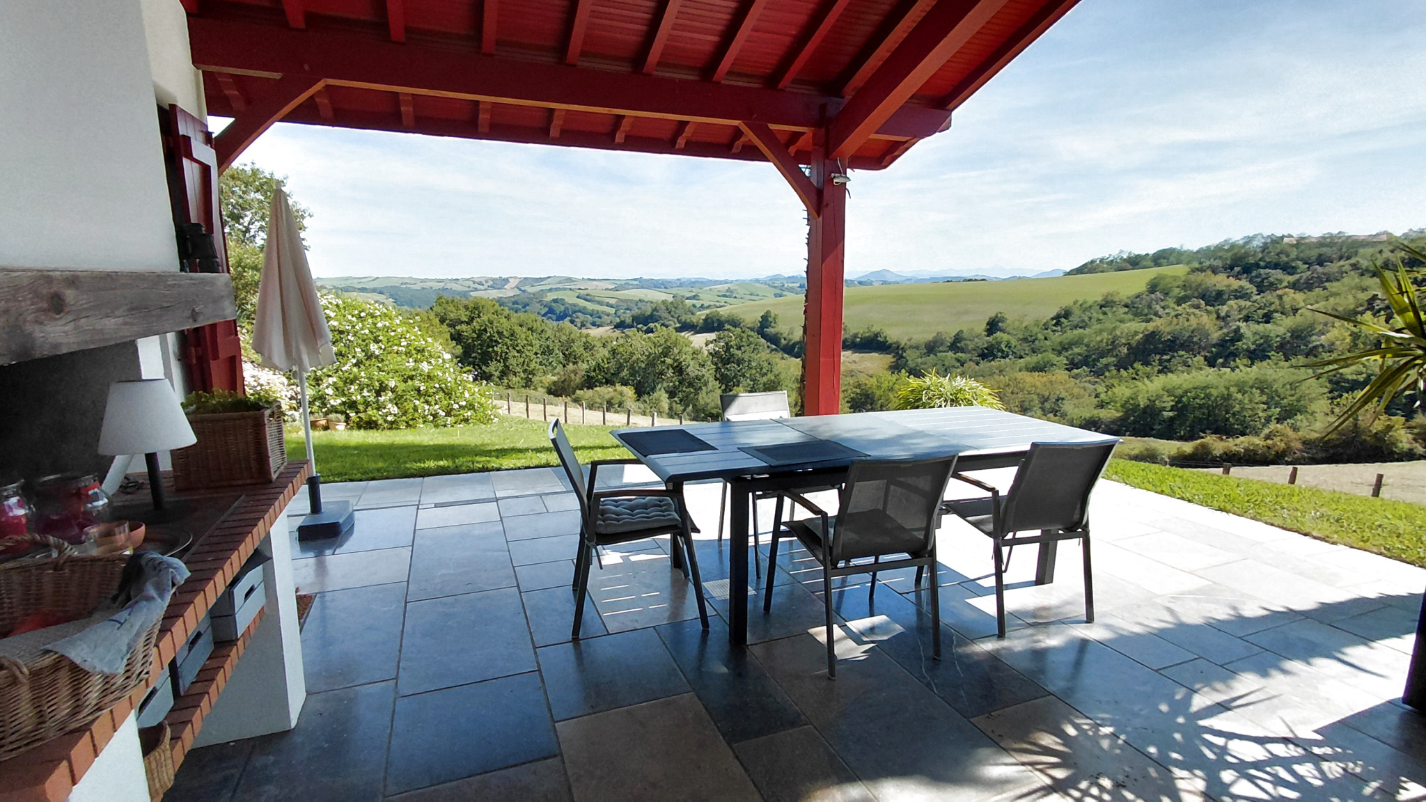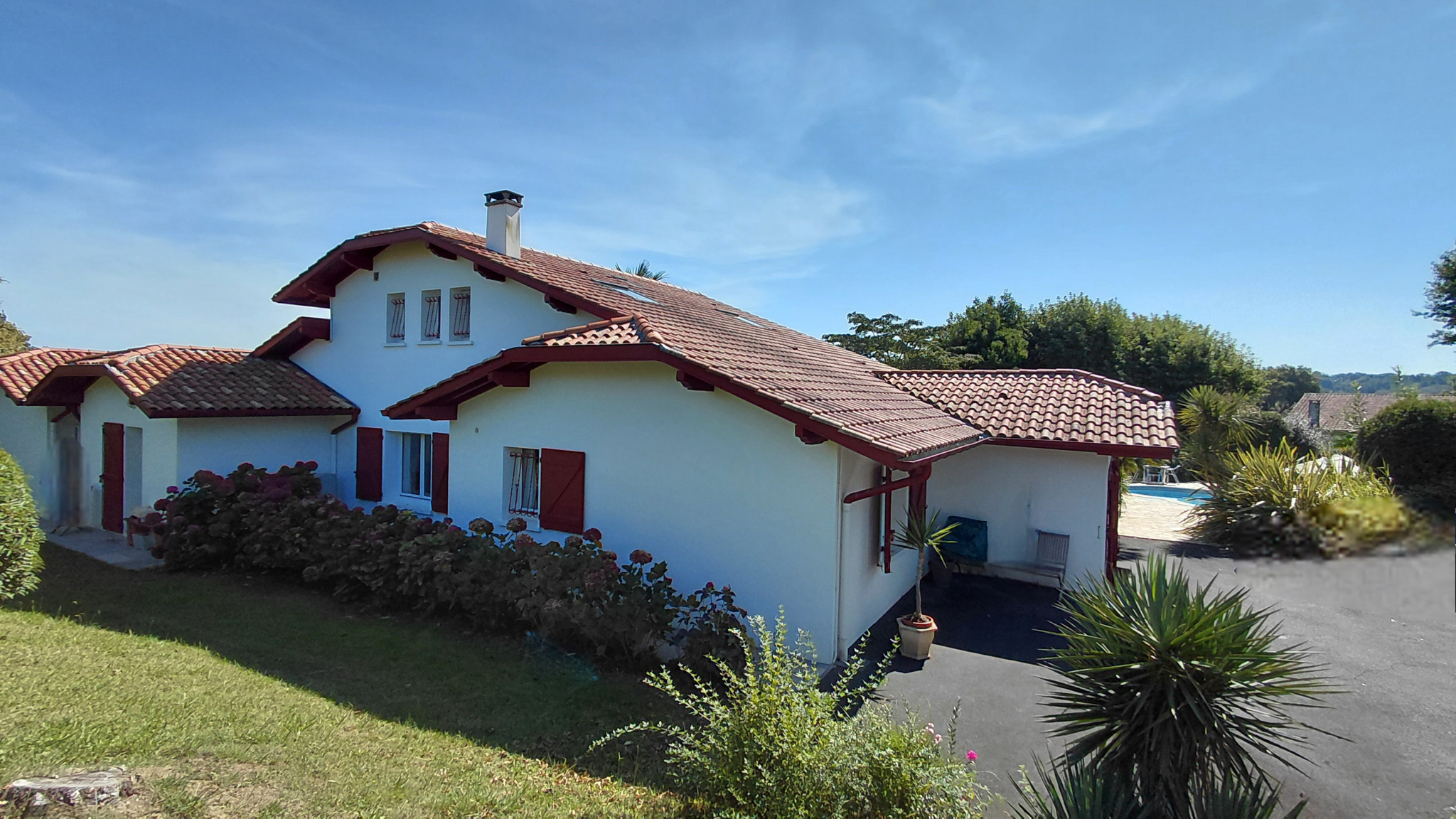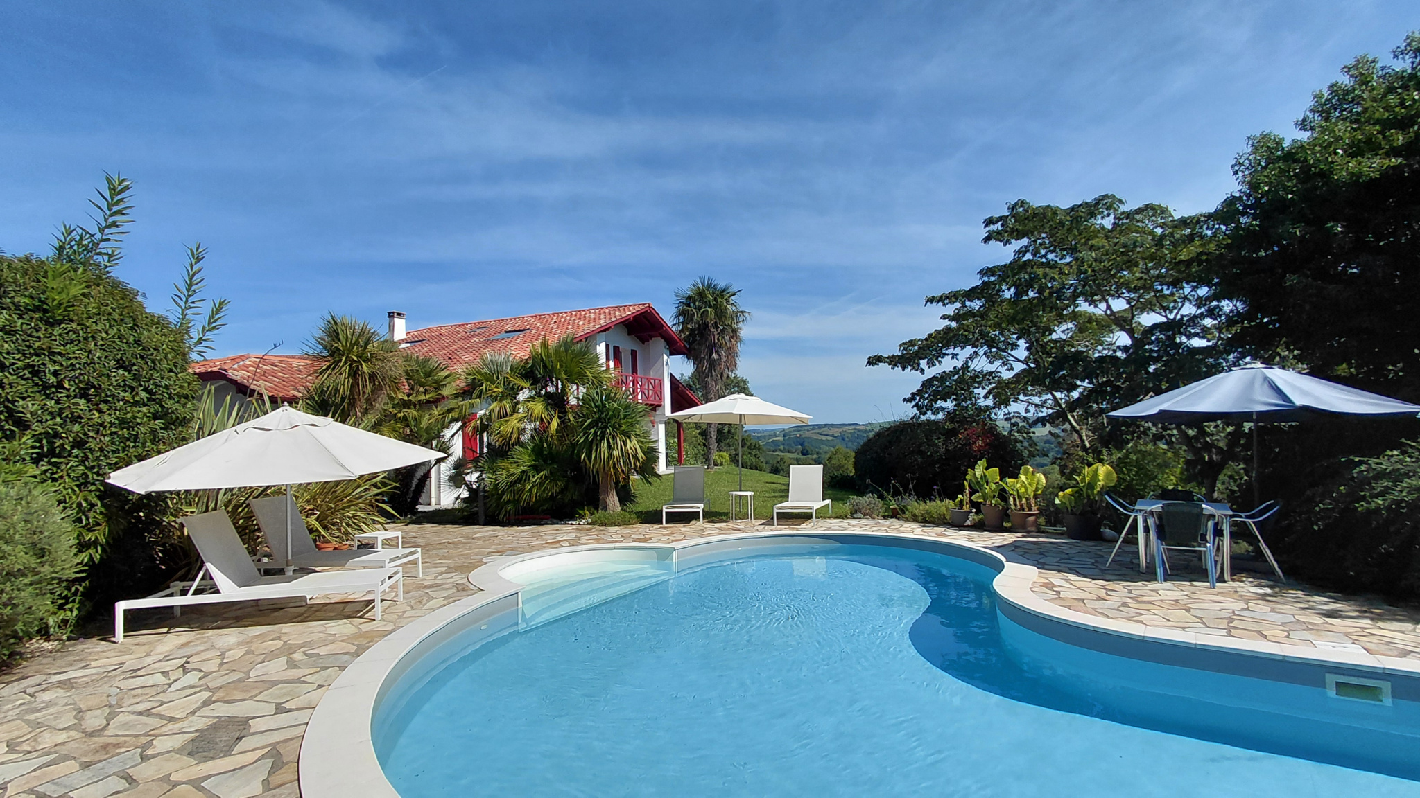 BRISCOUS, maison familiale alliant charme basque et confort moderne avec piscine sans vis à vis sur une parcelle arborée de 3150 m2 offrant une vue panoramique sur les montagnes.