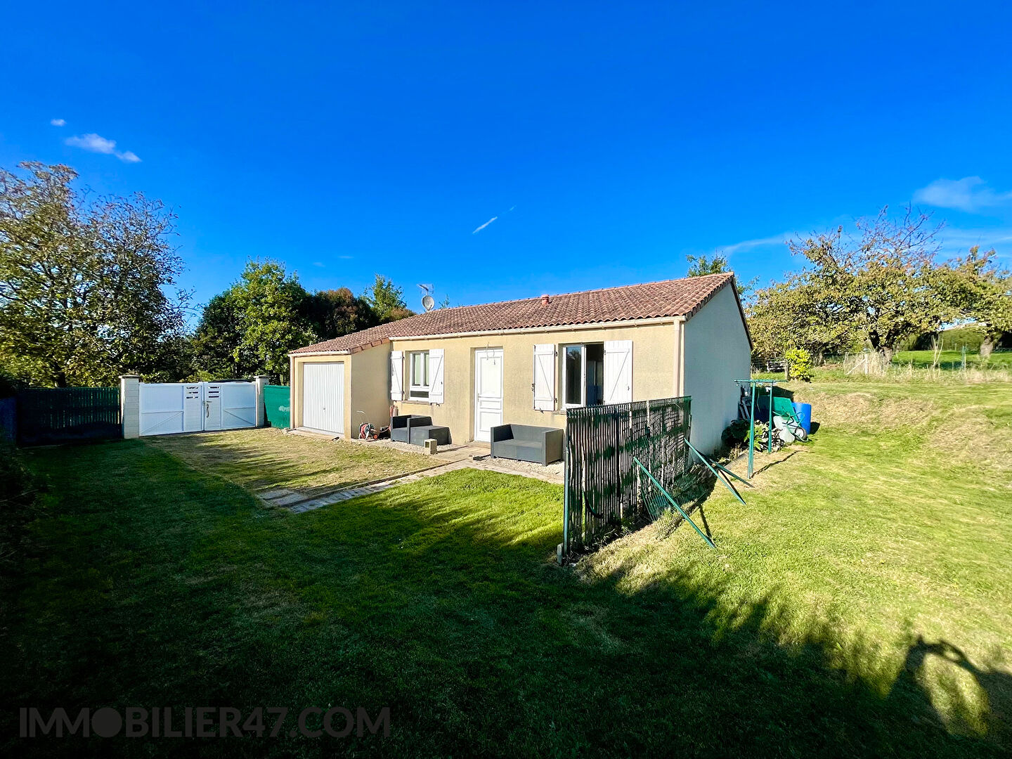 Sur la commune d'Aiguillon (47190), en campagne, villa de plain pied de construction traditionnelle et en parfait état, composée de trois chambres, vaste pièce à vivre d'environ 50m2, avec cuisine équipée et poêle à granules. Le tout sur environ 4200...