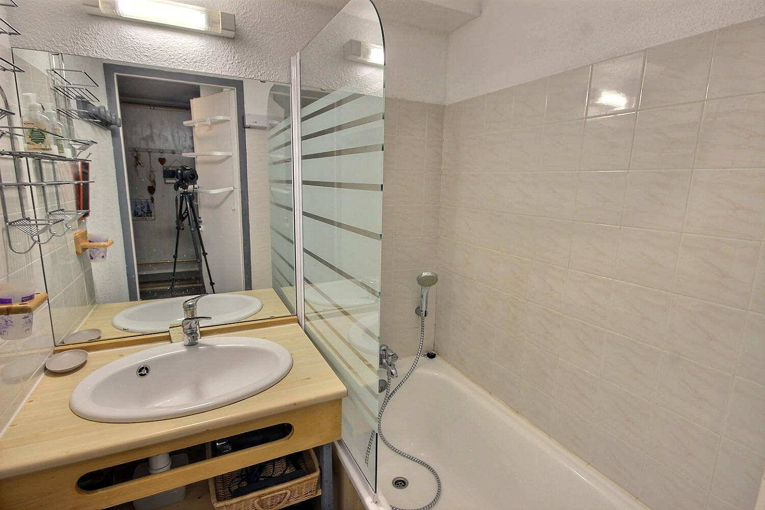 Ski aux pieds VALLANDRY Studio 24m² séjour double exposition Baie EST et fenêtre SUD. Meublé pour trois personnes. Balcon et casier à skis Possibilité de remeubler le coin montagne avec lits superposés à la place du dressing. Au centre de la station, tous comm...
