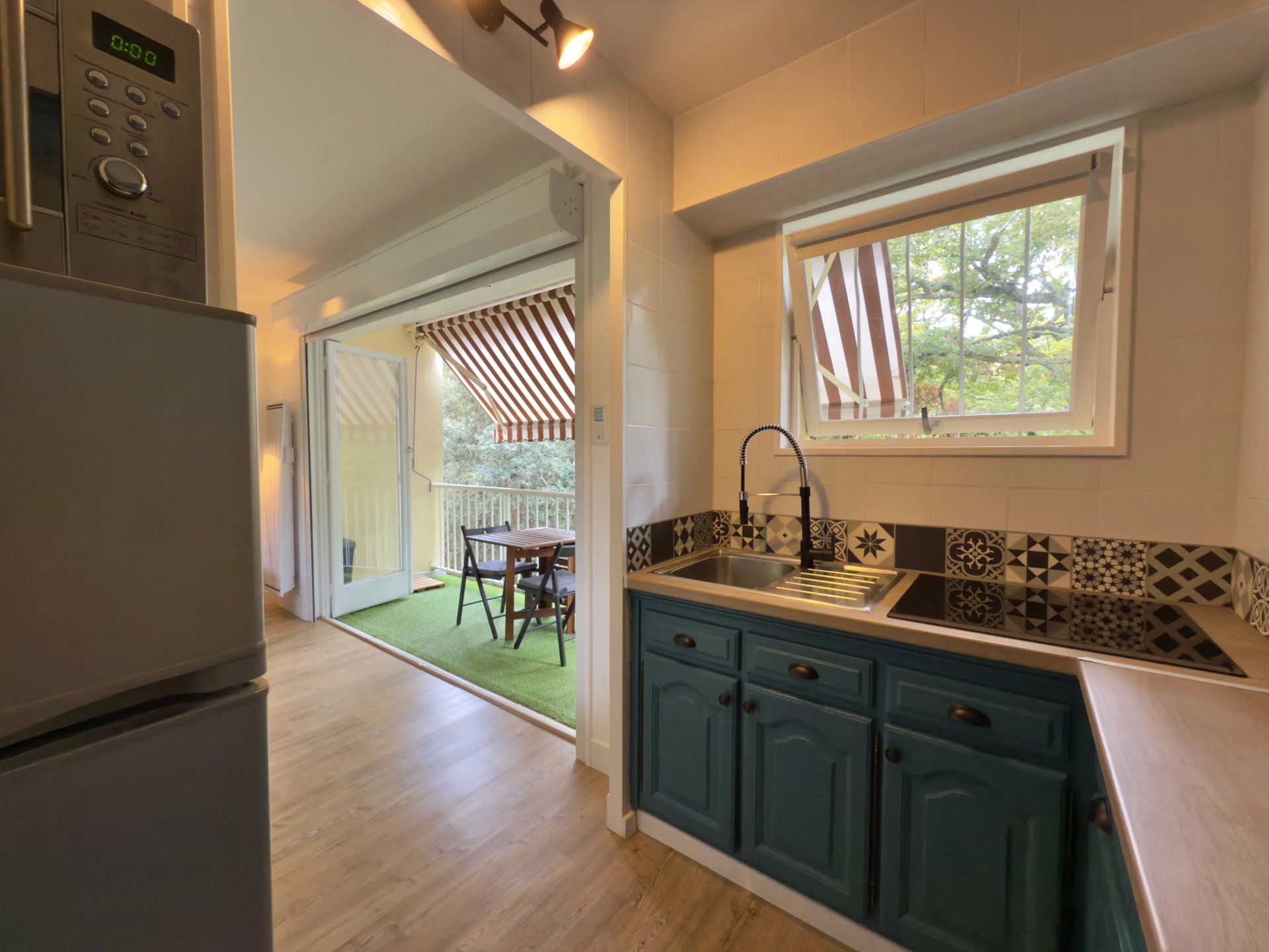 Vendu entièrement meublé et équipé : cuisine fonctionnelle avec électroménager complet et vaisselle.