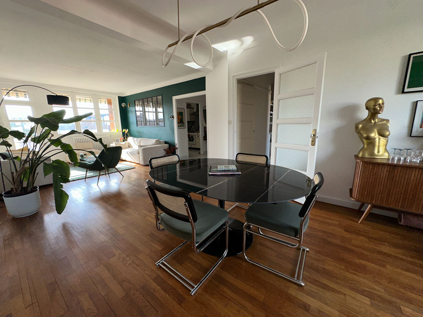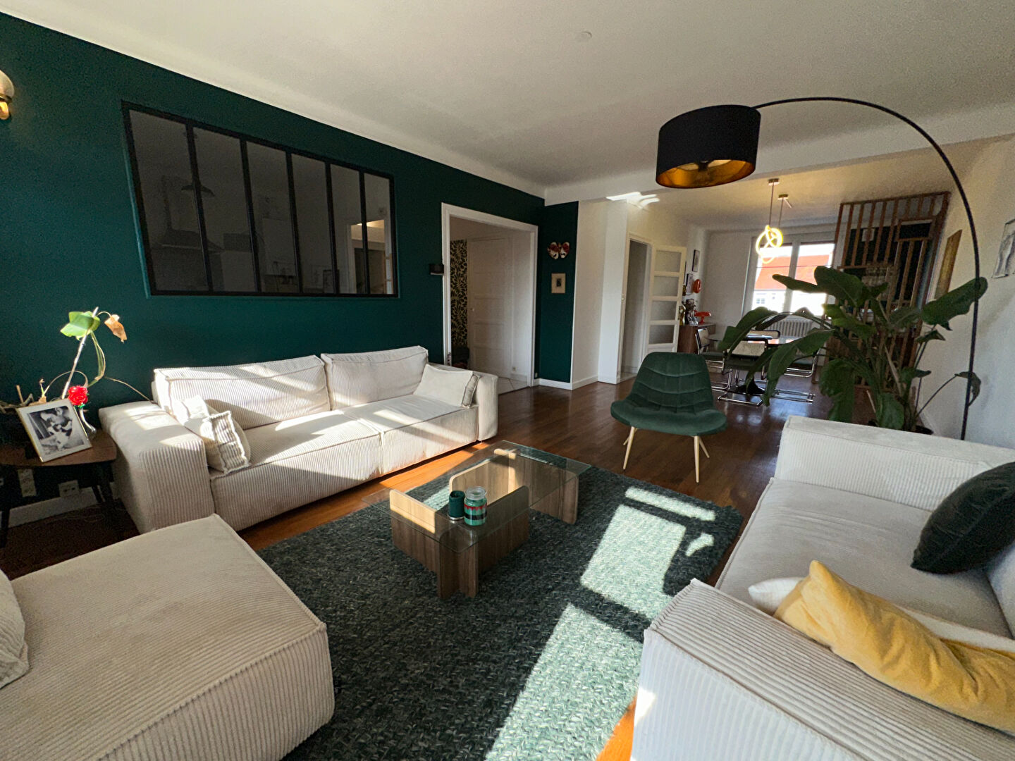 Ce T5 d'une superficie de 104 m² comprend : une entrée, un séjour-salon de plus de 33 m2, trois chambres, une cuisine équipée récente SCHMIDT, une s...