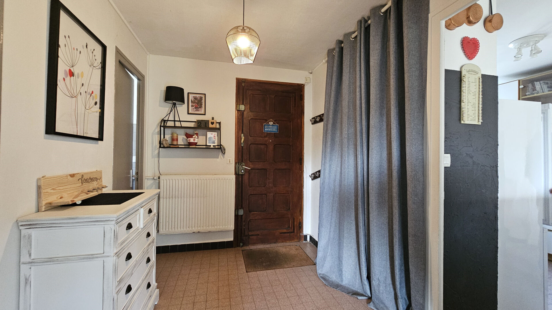 Entrée desservant 1 chambre, une cuisine, un coin salon, wc individuel.