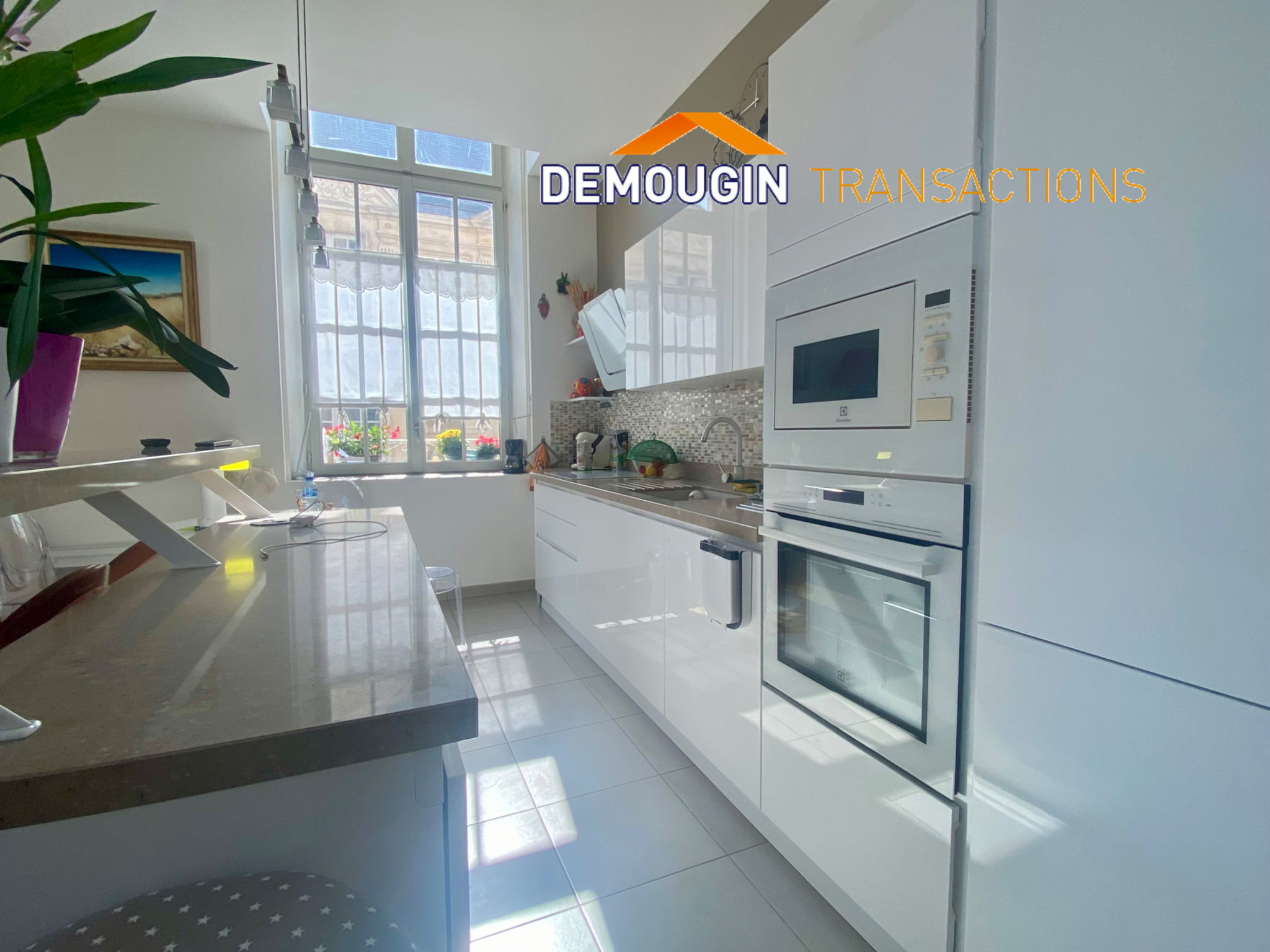 A deux pas du marché, cet appartement de type 2 en duplex, vous offre en rez-de chaussée une belle pièce de vie avec cuisine ouverte équipée.
