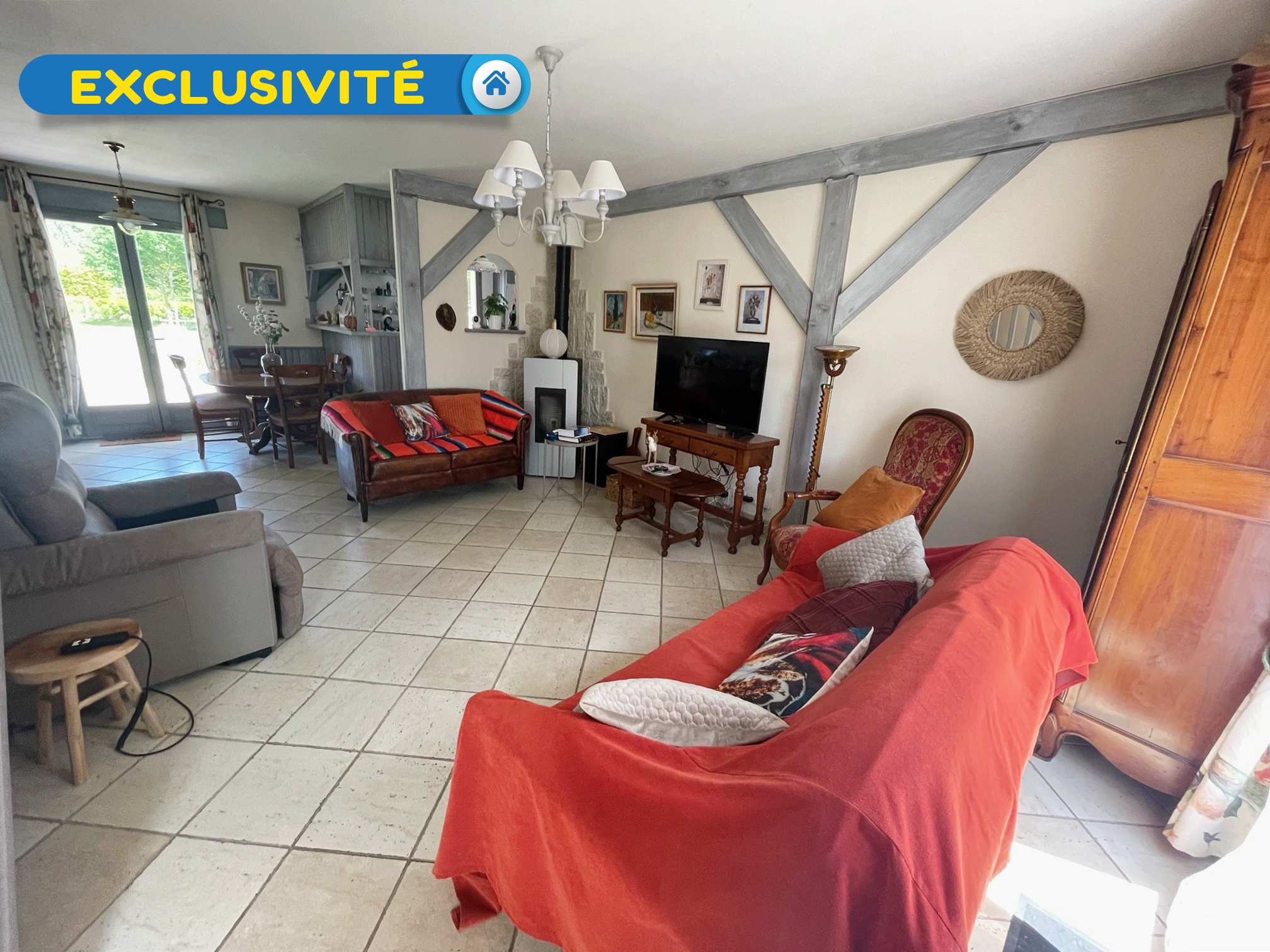 EXCLUSIVITE ! Au calme, maison de 124 m2 environ sur sous-sol total comprenant au rez-de-chaussée: entrée, grand séjour-salon avec cheminée et cuisine ouverte aménagée et équipée, couloir avec rangement, WC, salle de bains, deux chambres (dont une avec placard...