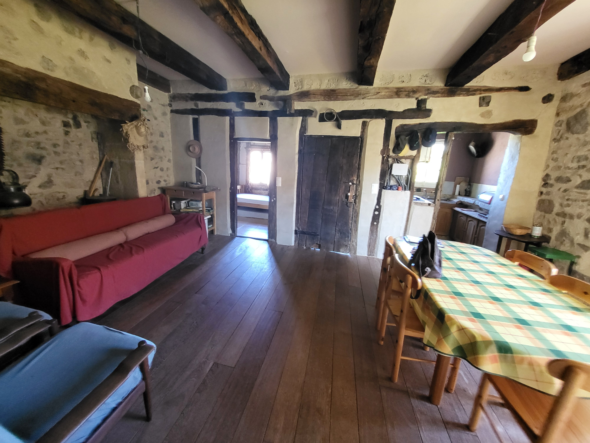 Pièce principale comprenant salon avec cheminée cantou équipée d'un poêle à bois, cuisine meublée et équipée, salle à manger et petite souillarde.