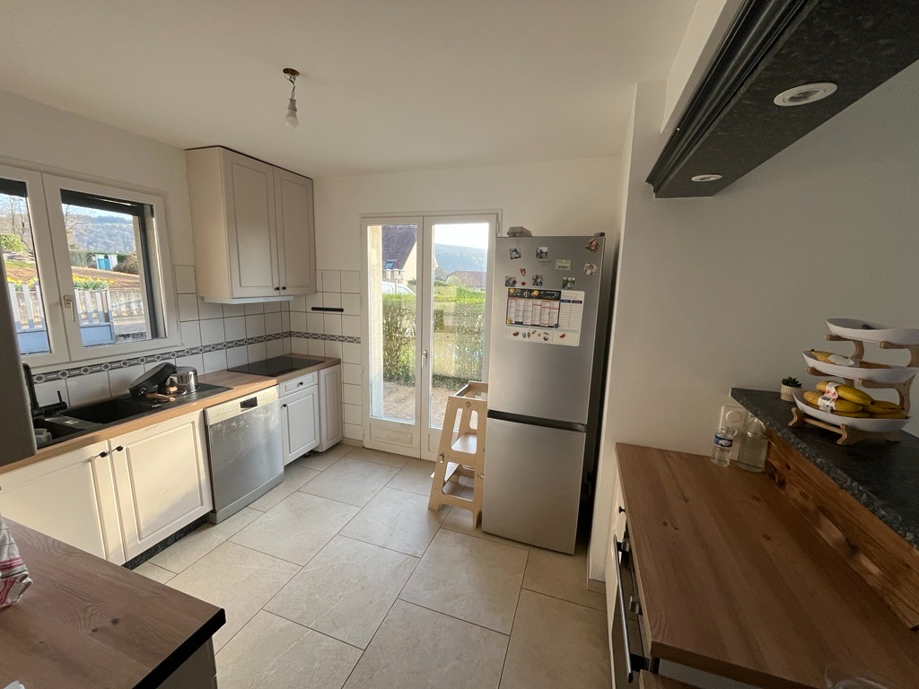 Sur la commune d' AVANNE, édifiée sur 750 M2 de terrain clos, plat et arboré, maison des années 90 dans un environnement calme avec jolie vue dégagée composée d'une cuisine meublée et équ...