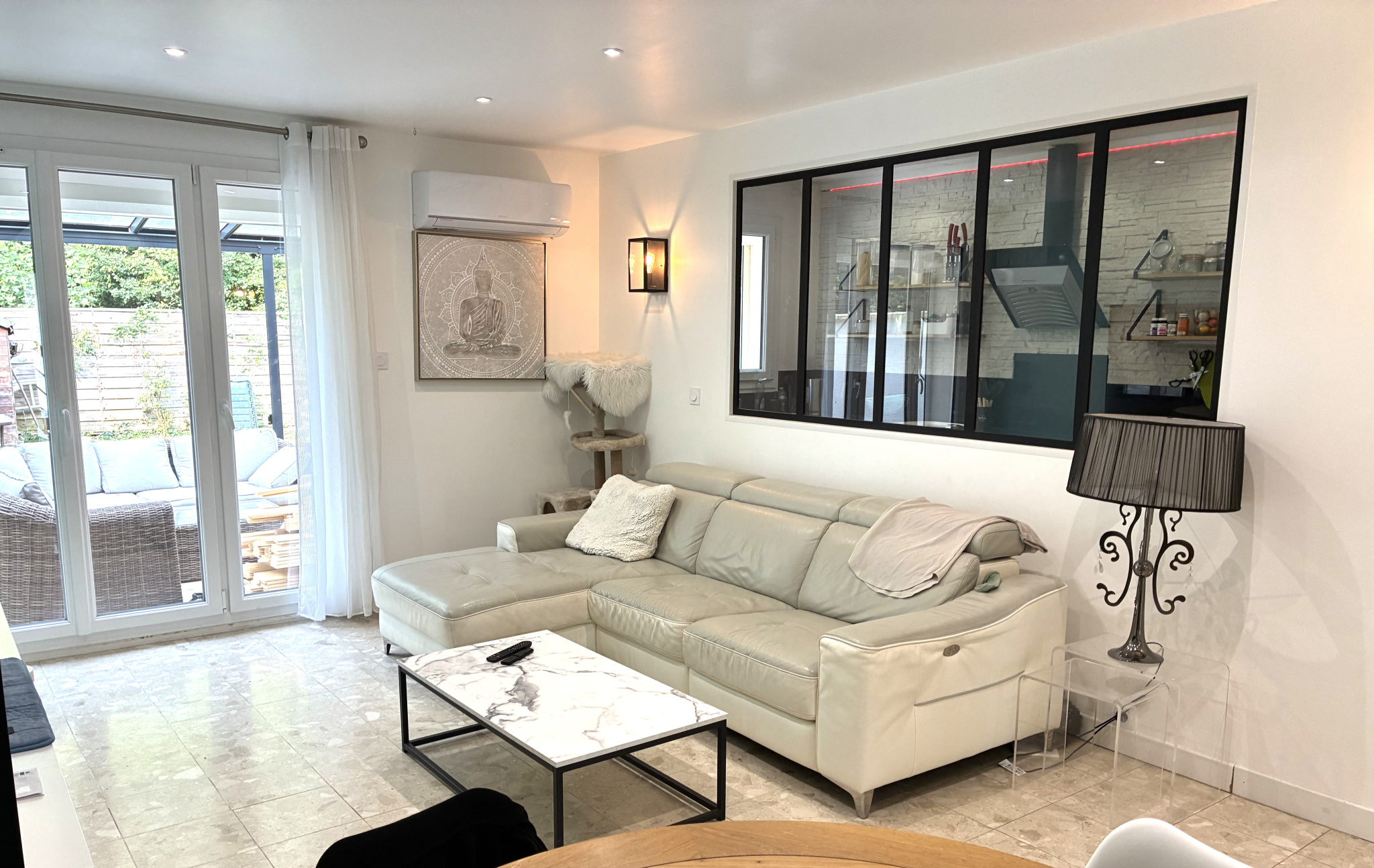 Une entrée donnant sur une belle pièce à vivre avec coin cuisine, une chambre lumin...