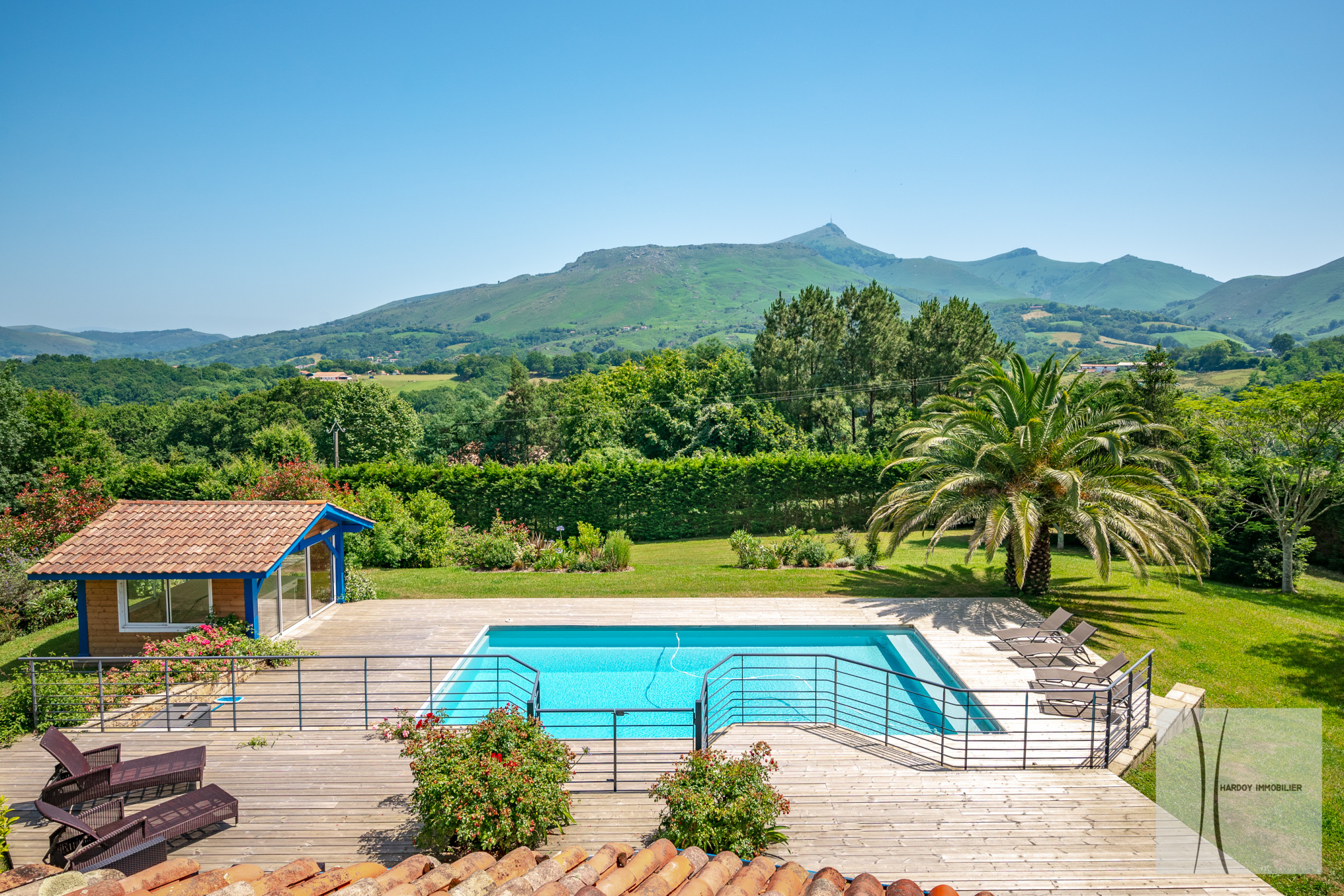 Située en position dominante, au calme et face à la Rhune, superbe Propriété composée d'une maison d'architecte d'environ 350 m2 édifiée sur un terrain de 7 000 m2 avec piscine.