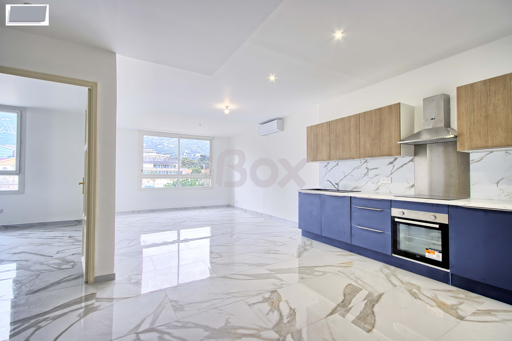 Cuisine americaine avec sa buanderie.