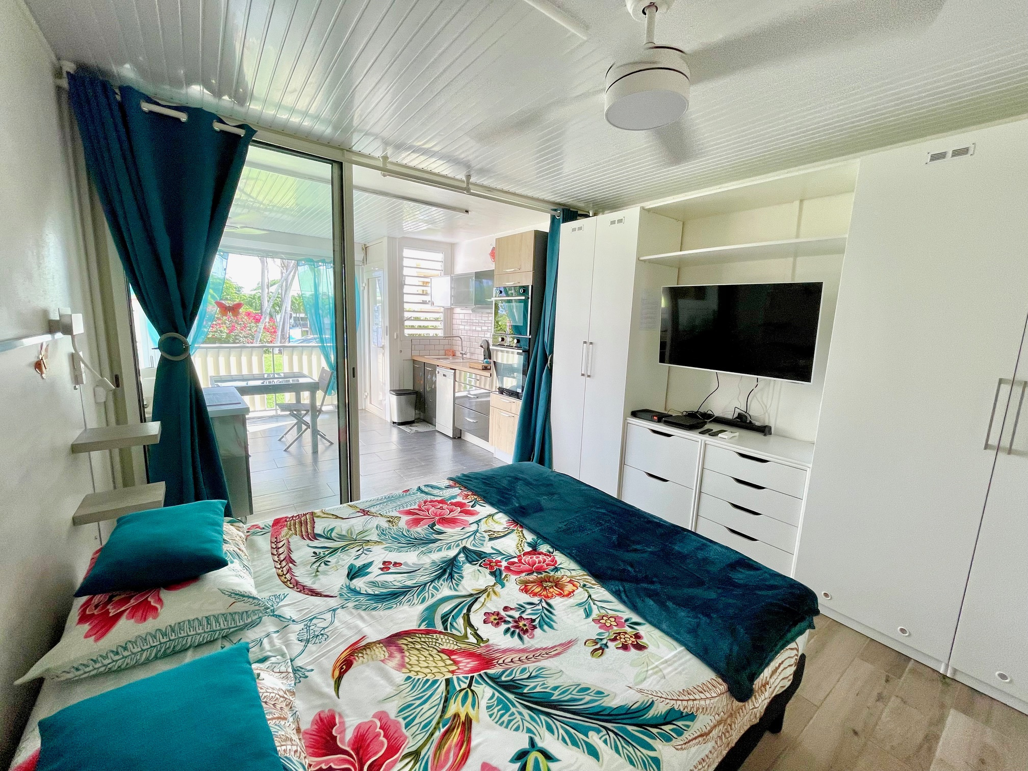 Une belle pièce à vivre avec un coin nuit séparé, une belle cuisine, une salle d'eau et un wc.
