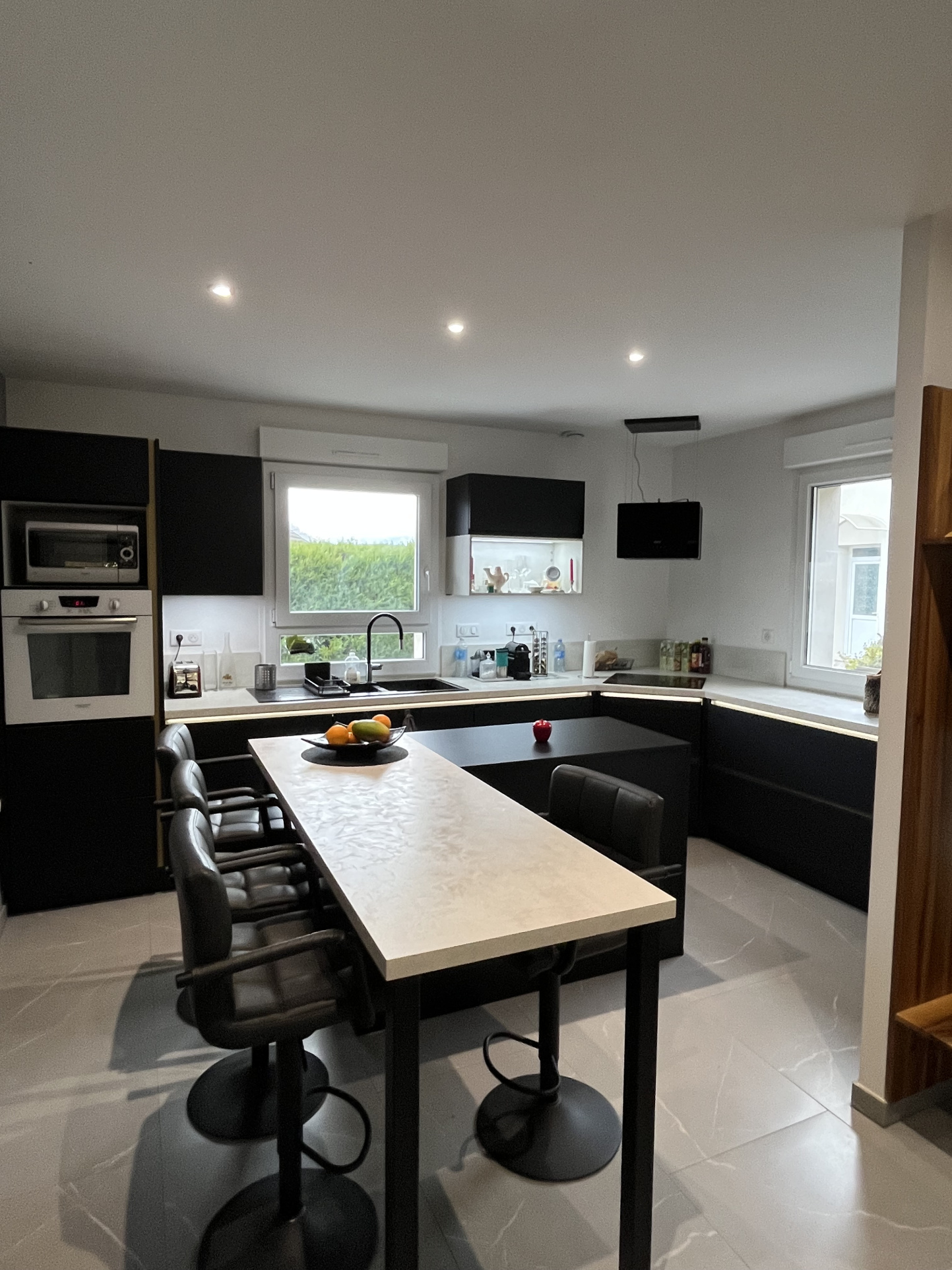La cuisine équipée se prolonge dans un séjour très conviviale avec sa cheminée bois touche ...