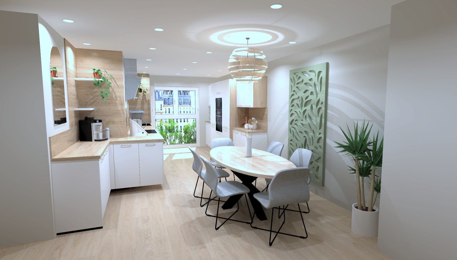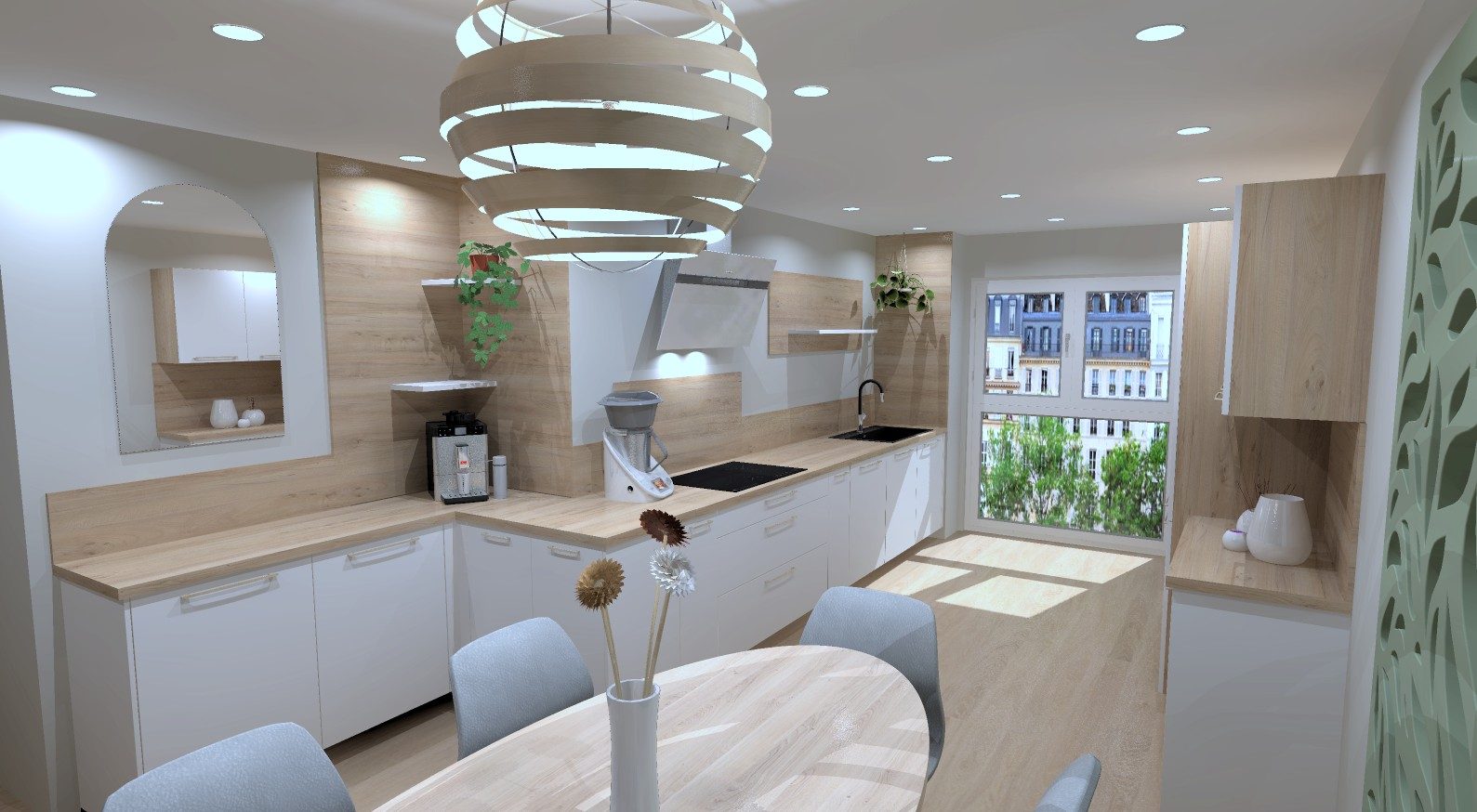 Entrée, pièce de vie avec coin cuisine donnant sur la terrasse et le jardin privatif arrière cuis...