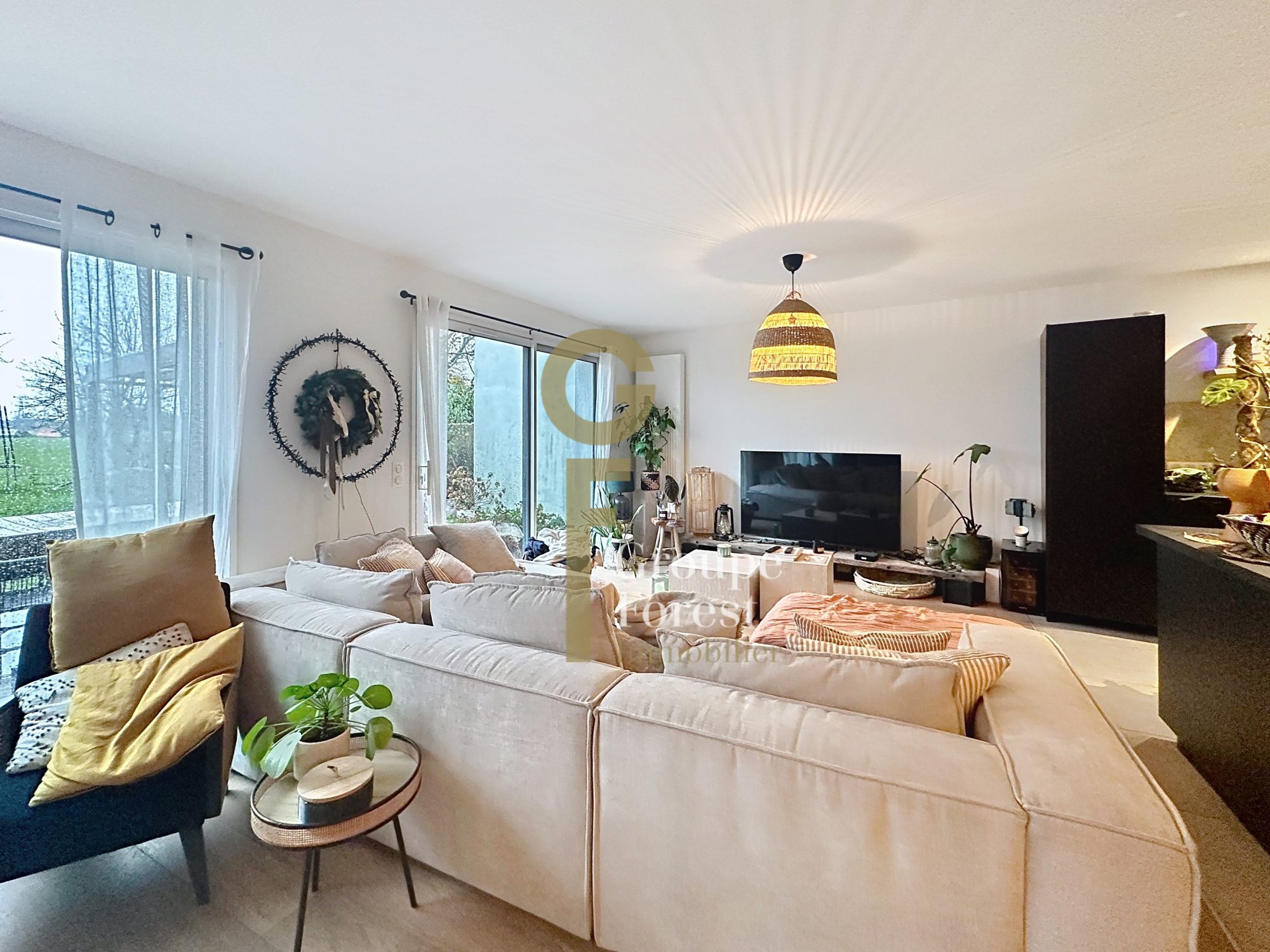 Un hall d'entrée, une grande pièce de vie baignée de lumière (Salon - salle à manger - cuisine), le tout donnant sur un ja...