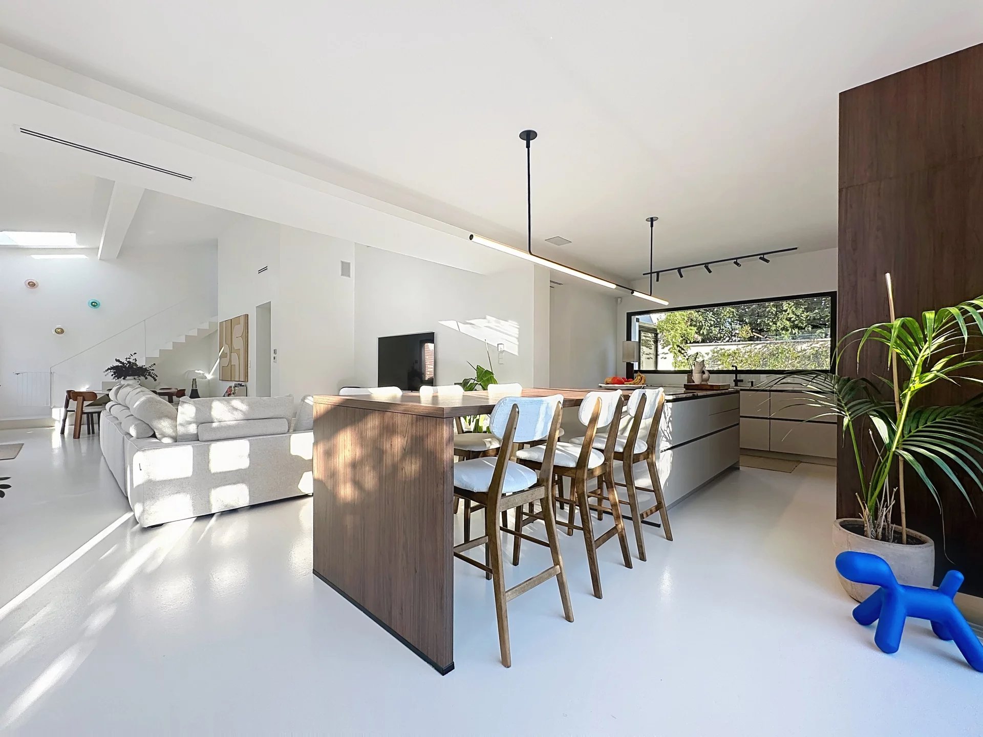 Un hall d'entrée avec toilette invités, un vaste pièce de vie de 60 m² avec une cuisine ouverte entièrement équipée, une suite parentale...