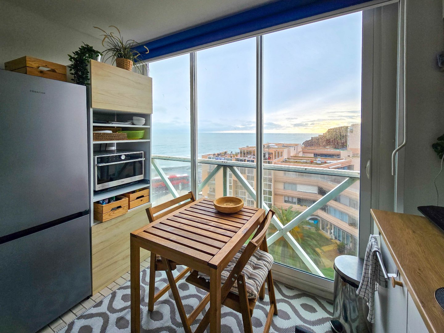 Dans une copropriété bien entretenue avec piscine, idéalement située entre le c?ur de ville et les plages, découvrez ce T2 offrant une vue imprenable sur la mer.