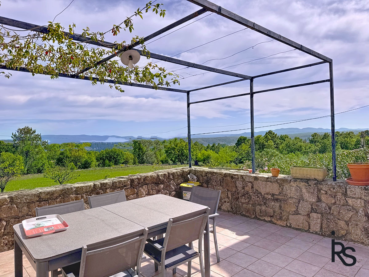 Avec un vue splendide, une maison en pierre de 145 m2 avec et 1,4 ha de terrain attenant, un garage et une cave. Elle est composée d'une partie principale de 100 m2 comprenant une salle à manger-cuisine, un salon, deux chambres, une salle d'eau et un...