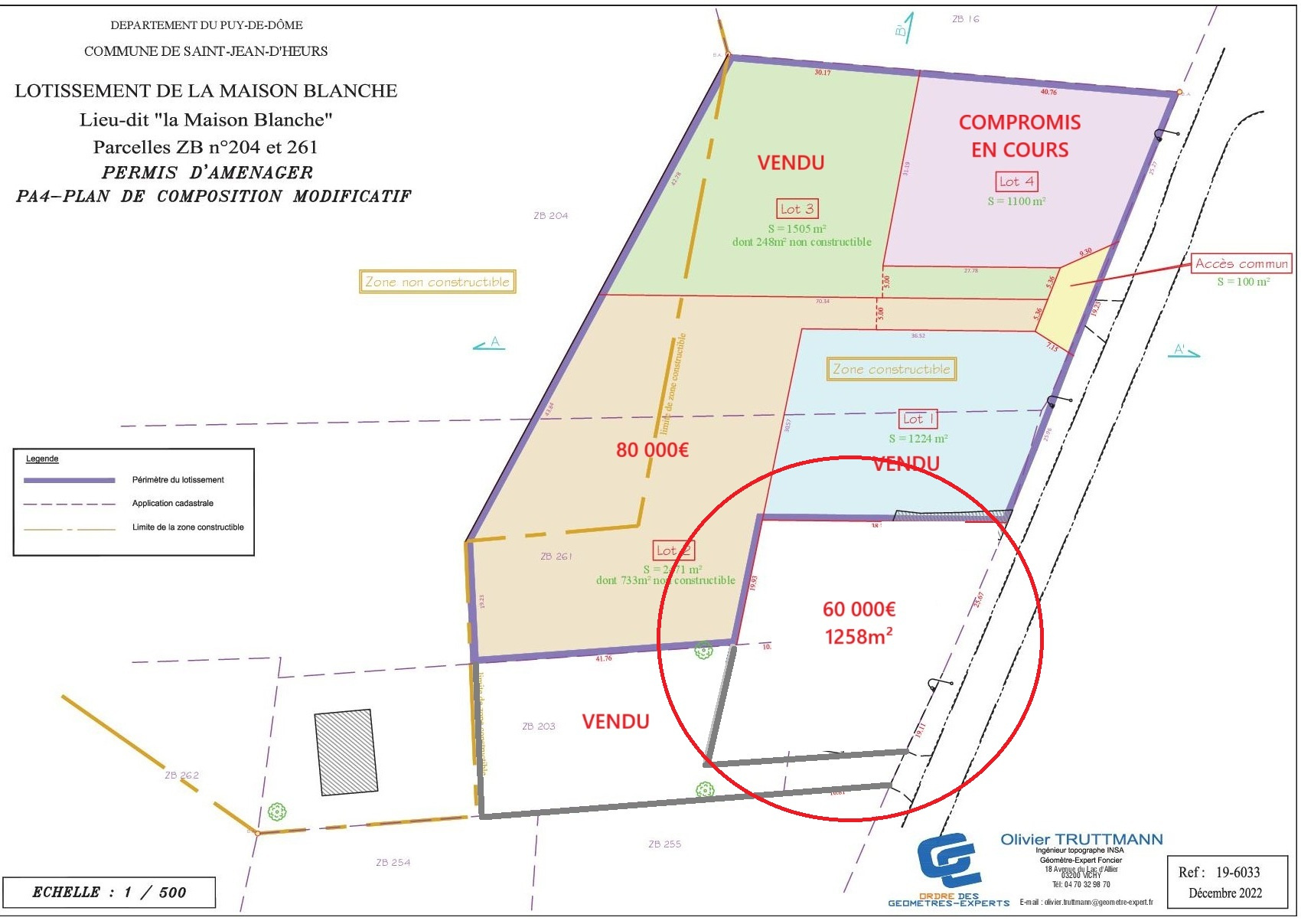 Situé entre Lezoux et Peschadoires, ce terrain plat bénéficie d'une viabilisation complète : eau, électricité, assainissement collectif et raccordement à la fibre optique déjà réalisés,