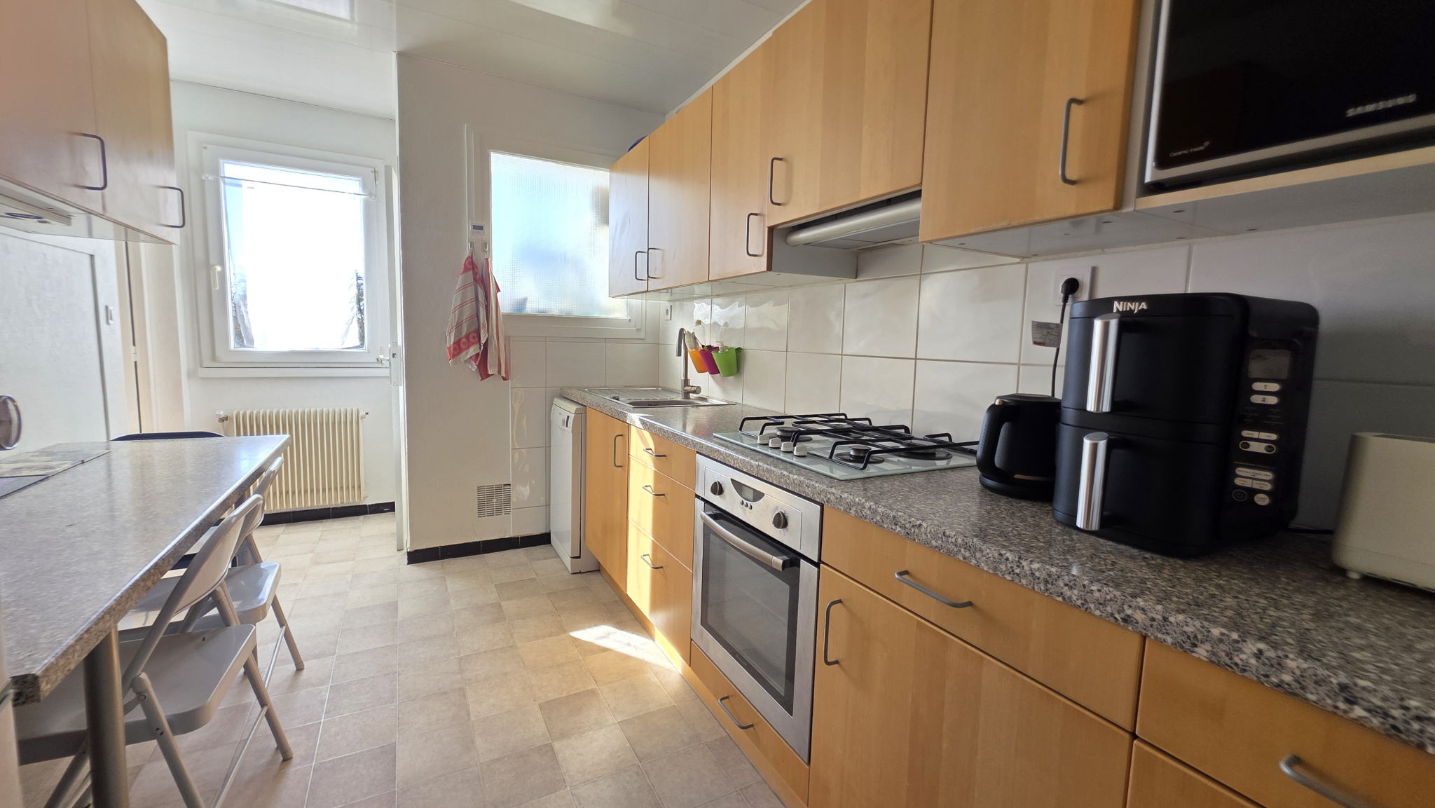 La cuisine est fonctionnelle et la salle de bain avec WC complète ce bien.