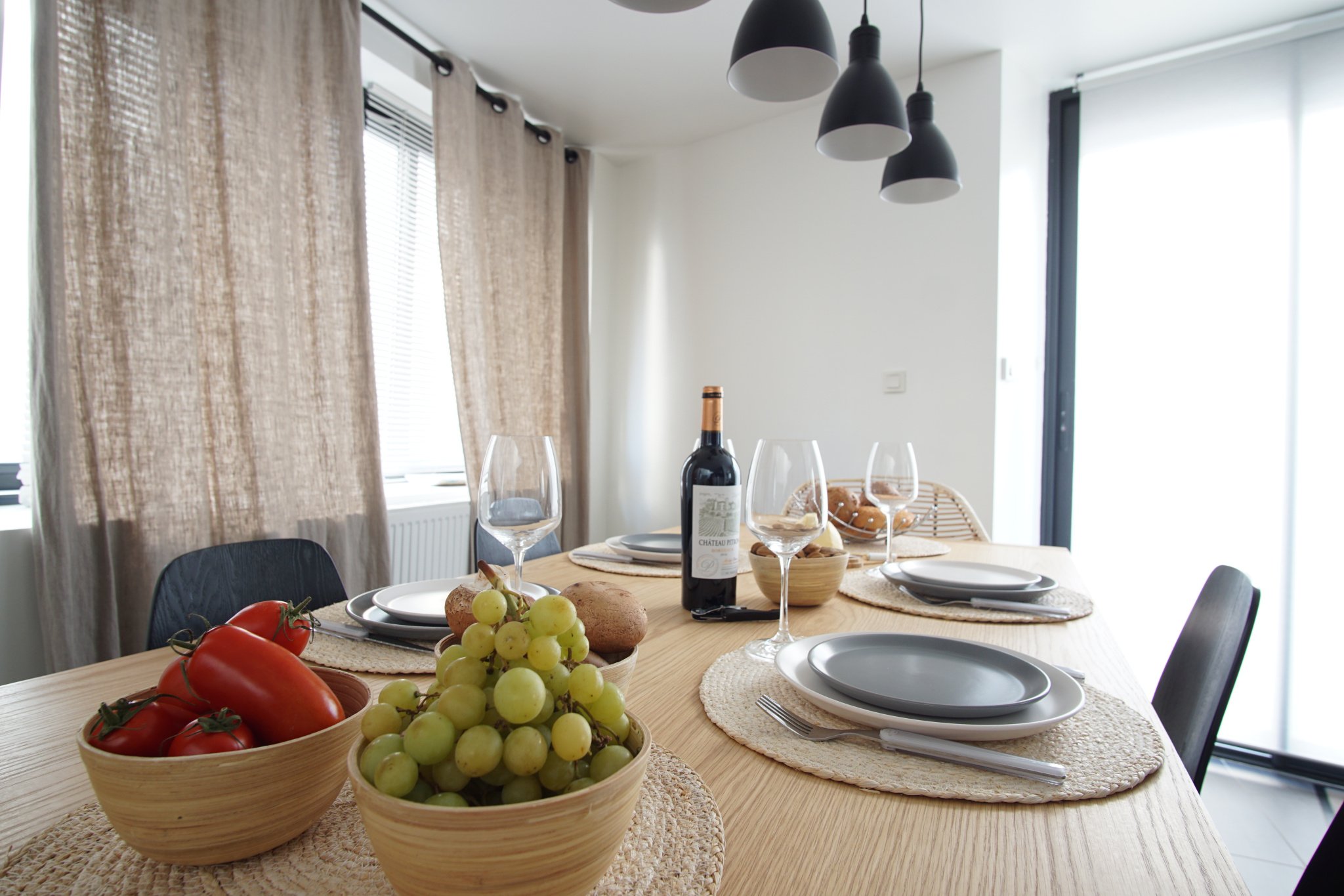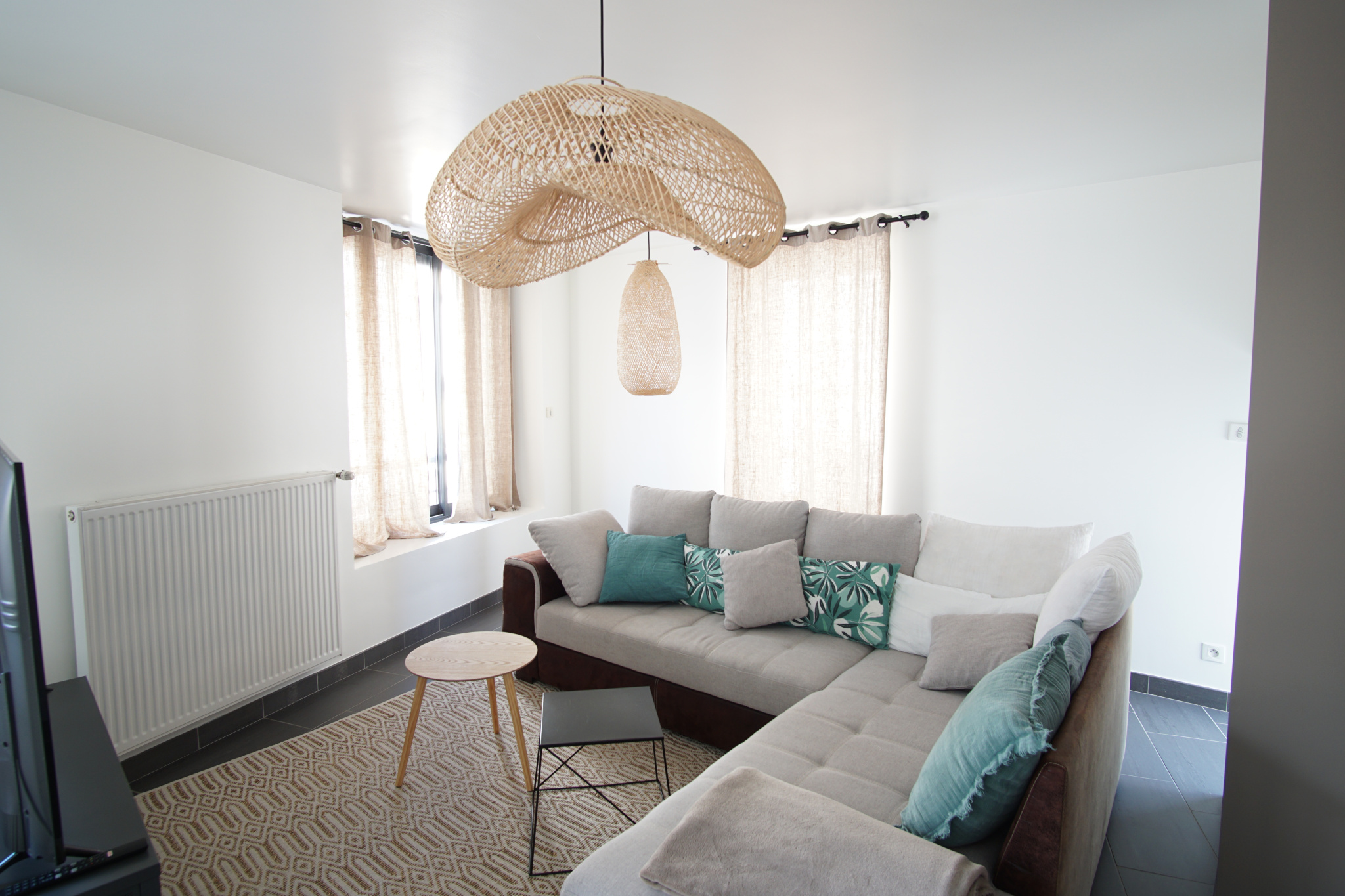 Le hall d'entrée dessert le séjour avec cuisine ouvert pour un total de plus de 30 m2, deux chambres, la salle d'eau et le WC.