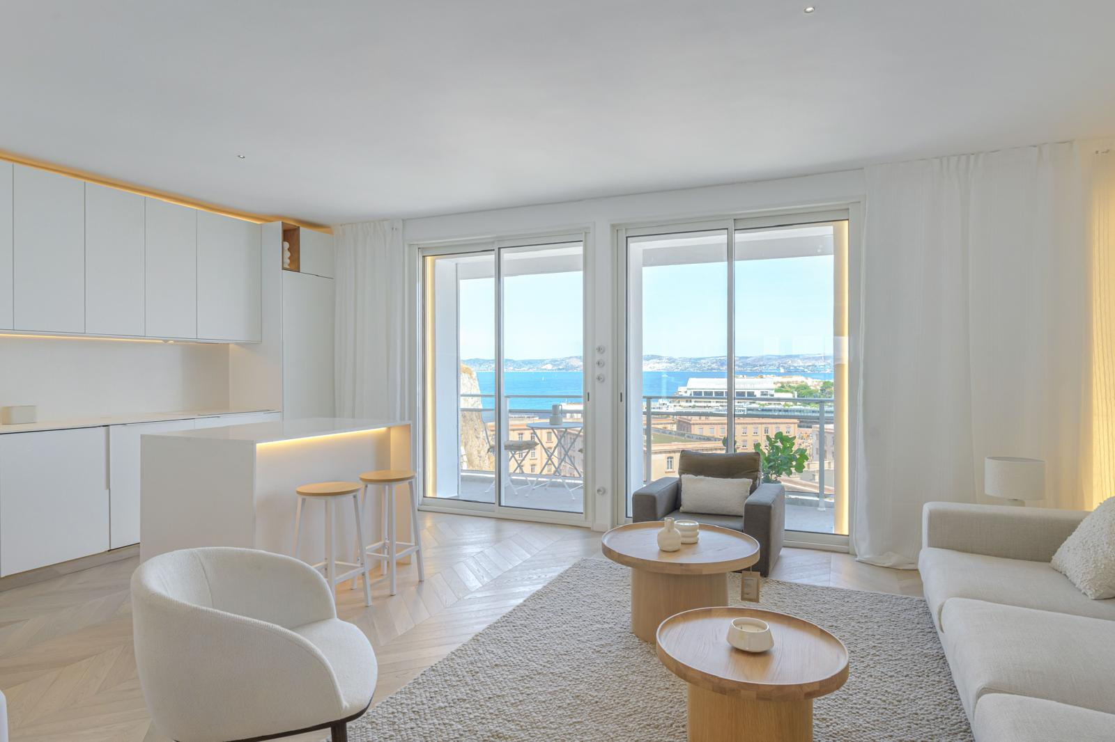 Face à la plage des Catalans, là où la mer rejoint la ville, s'ouvre un appartement d'e...