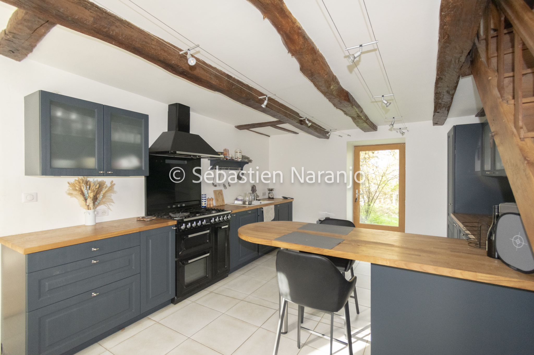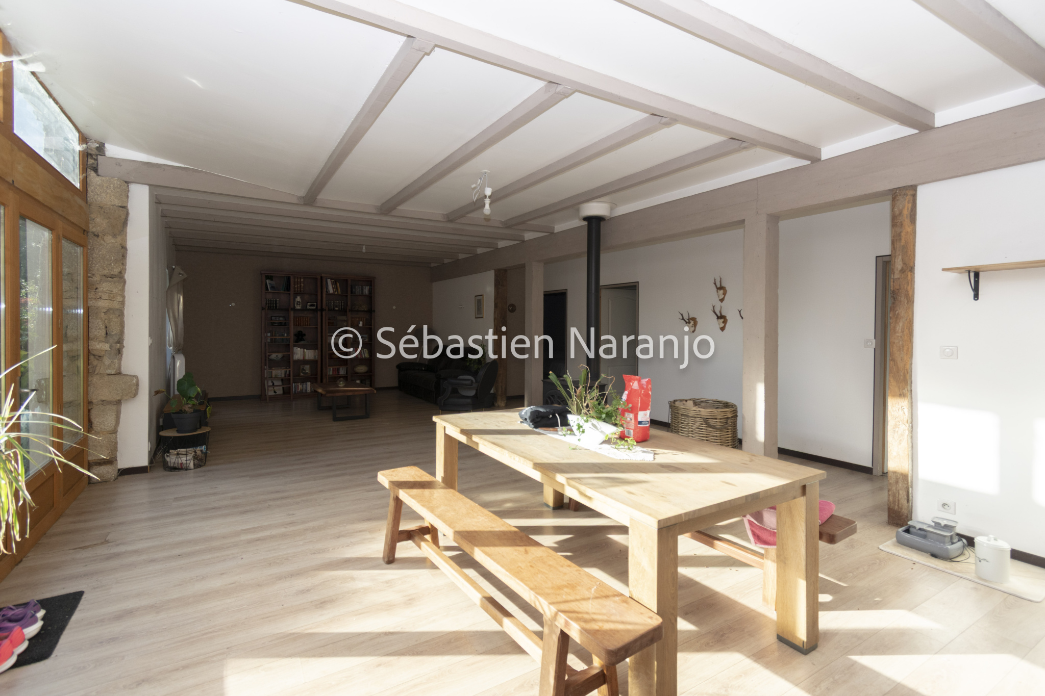 Elle se compose d'un grand salon traversant équipé d'un poêle à bois et ouvrant...