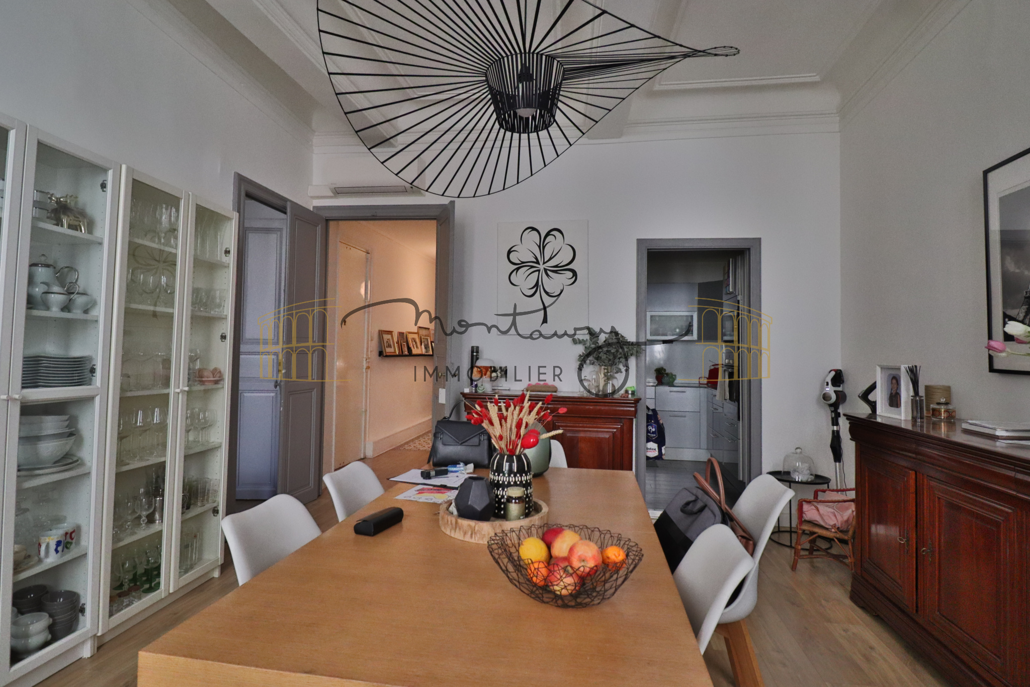 NIMES REVOLUTION / BOUQUERIE Au sein d'un immeuble aux faibles charges, superbe appartement de type P5 de 130m2 environ au 1er étage baigné de lumière offrant un très bel espace de vie de 50 m2 environ, 4 belles chambres, 2 salles de douche et coin bureau...