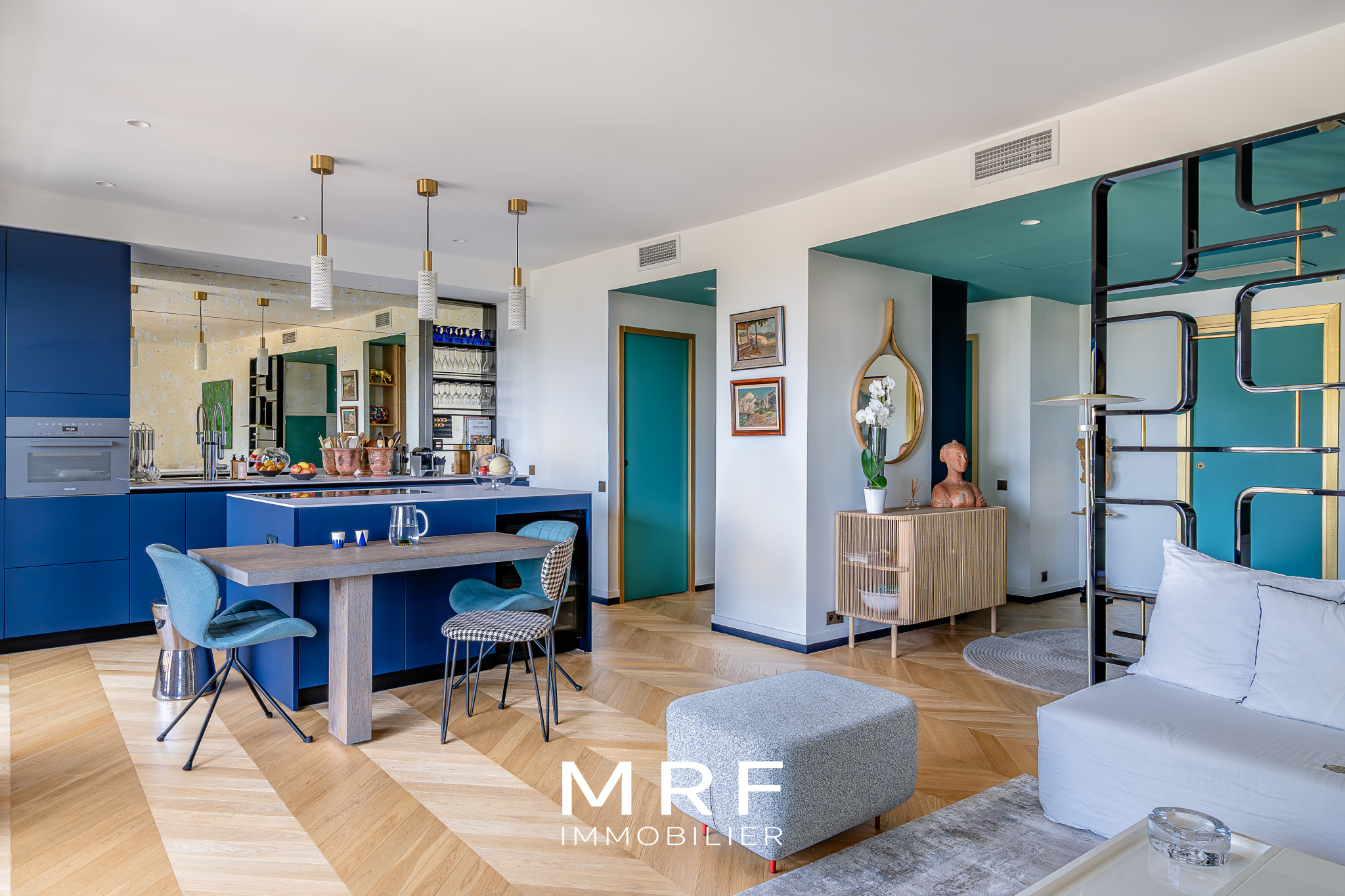 Situé au dernier étage d'un immeuble signé BENTZ et DEVIN du recherché Carré d'Or, cet appartement de 197 m2 avec extérieurs offre une vue époustouflante sur la ville et la mer au loin.