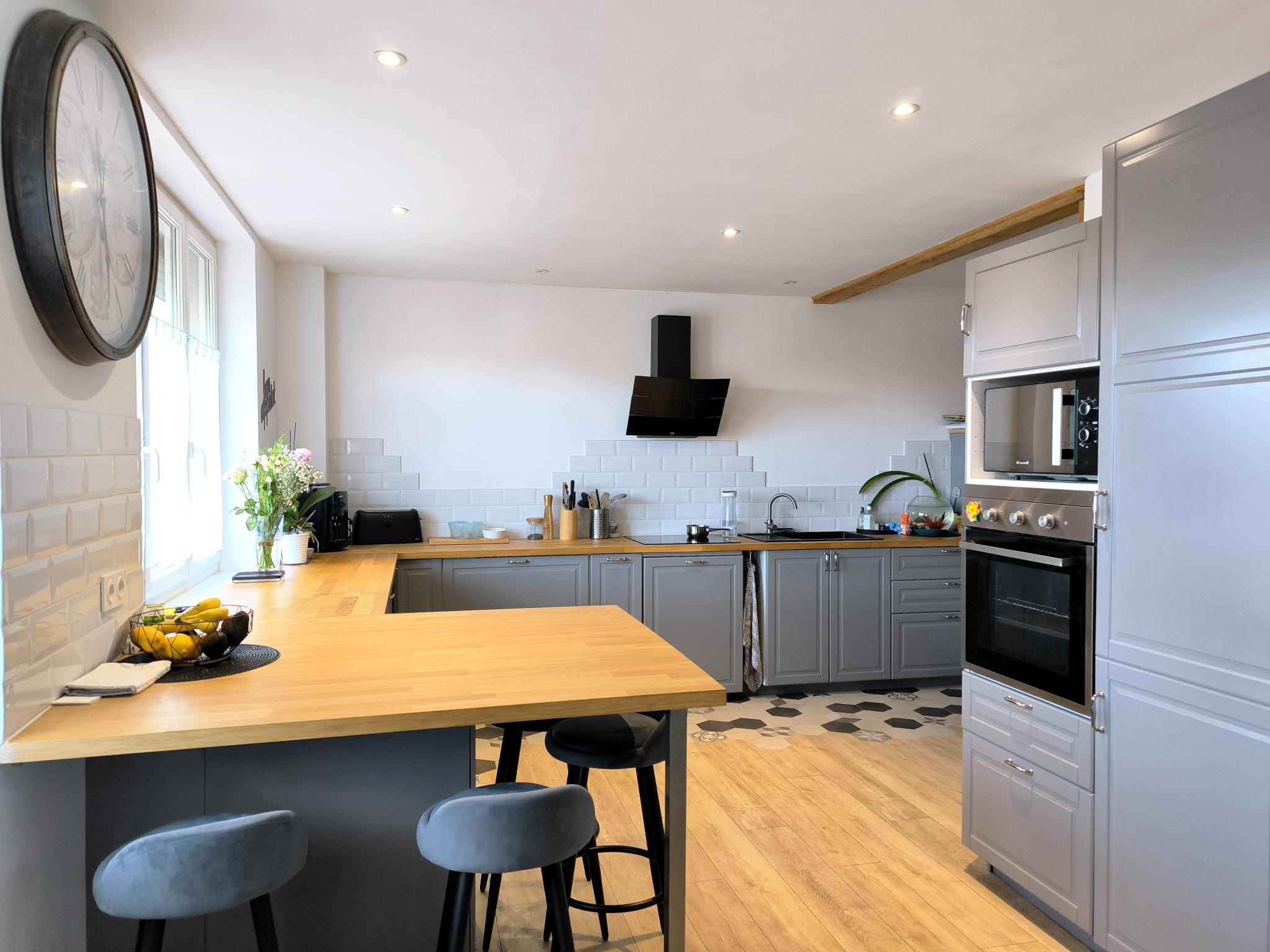 Séjour / salon lumineux de 65m2 avec poêle à granulés, cuisine équipée et aménagée avec coin repas, 5 chambr...