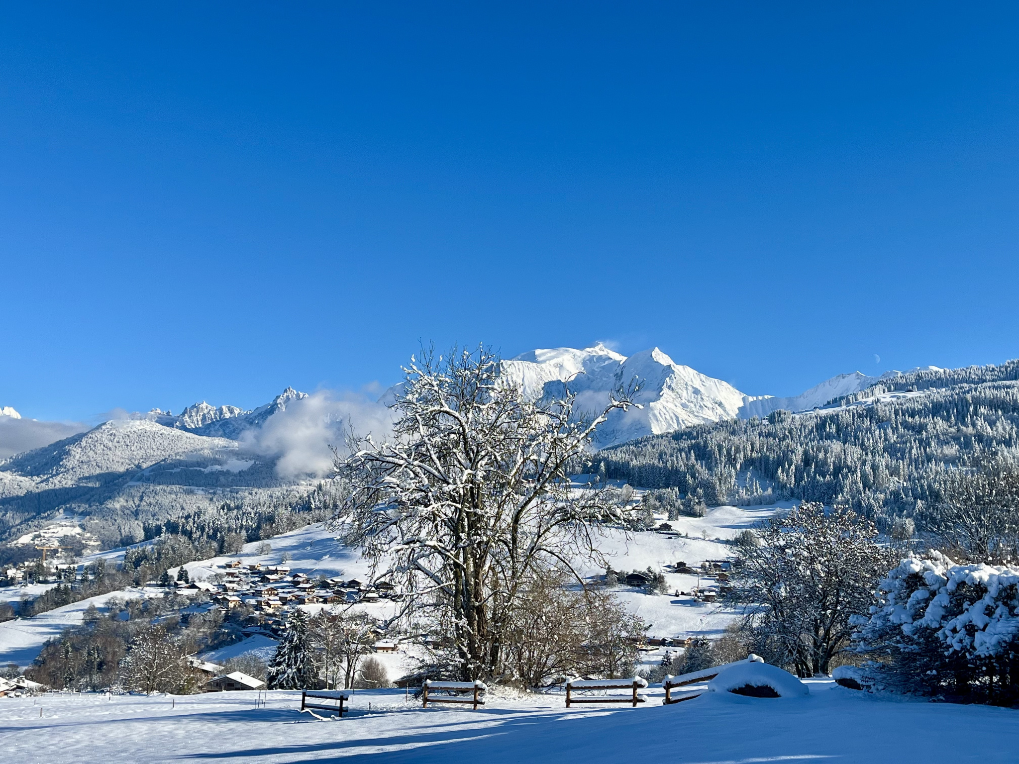 Vue à 180oC depuis la grande terrasse couverte de ce vaste studio avec alcôve, au centre du village de Combloux !