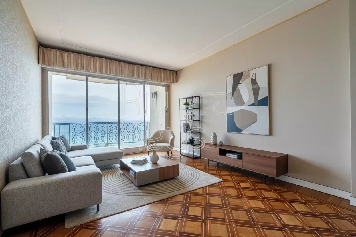 Ce superbe appartement de 62 m², entièrement rénové avec des matériaux haut de gamme, domine la baie de Villefranche, le Cap-Ferrat et jusqu’à Villeneuve-Loubet.