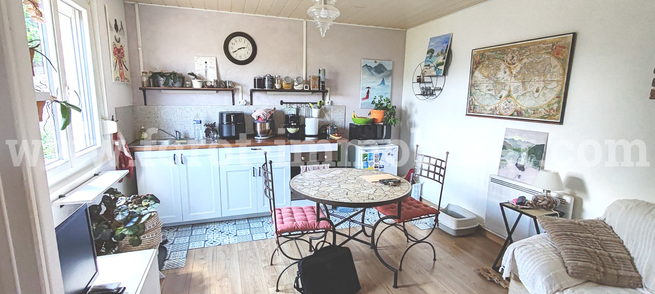 Une pièce de vie avec sa cuisine ouverte aménagée et équipée, une chambre.