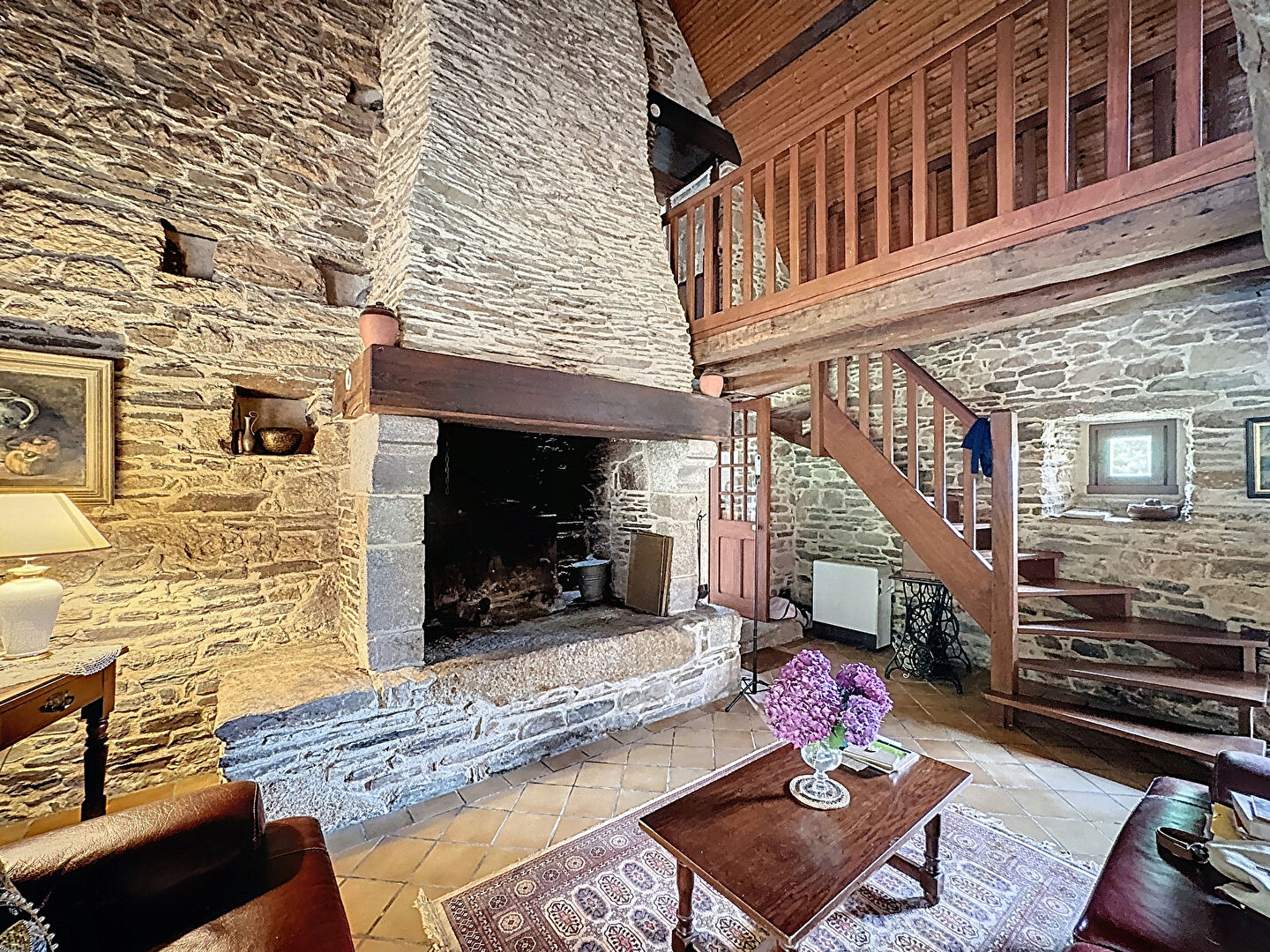 Entrée avec placard, wc, Cuisine indépendante, Séjour/Salon de 60 m2 avec cheminée (foyer ouvert), poutres apparentes, et murs pierres.