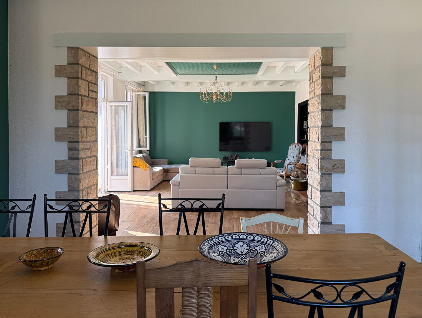 La vaste pièce de vie réunit une cuisine ouverte, un espace salle à manger convivial et un salon chaleureux agrément...