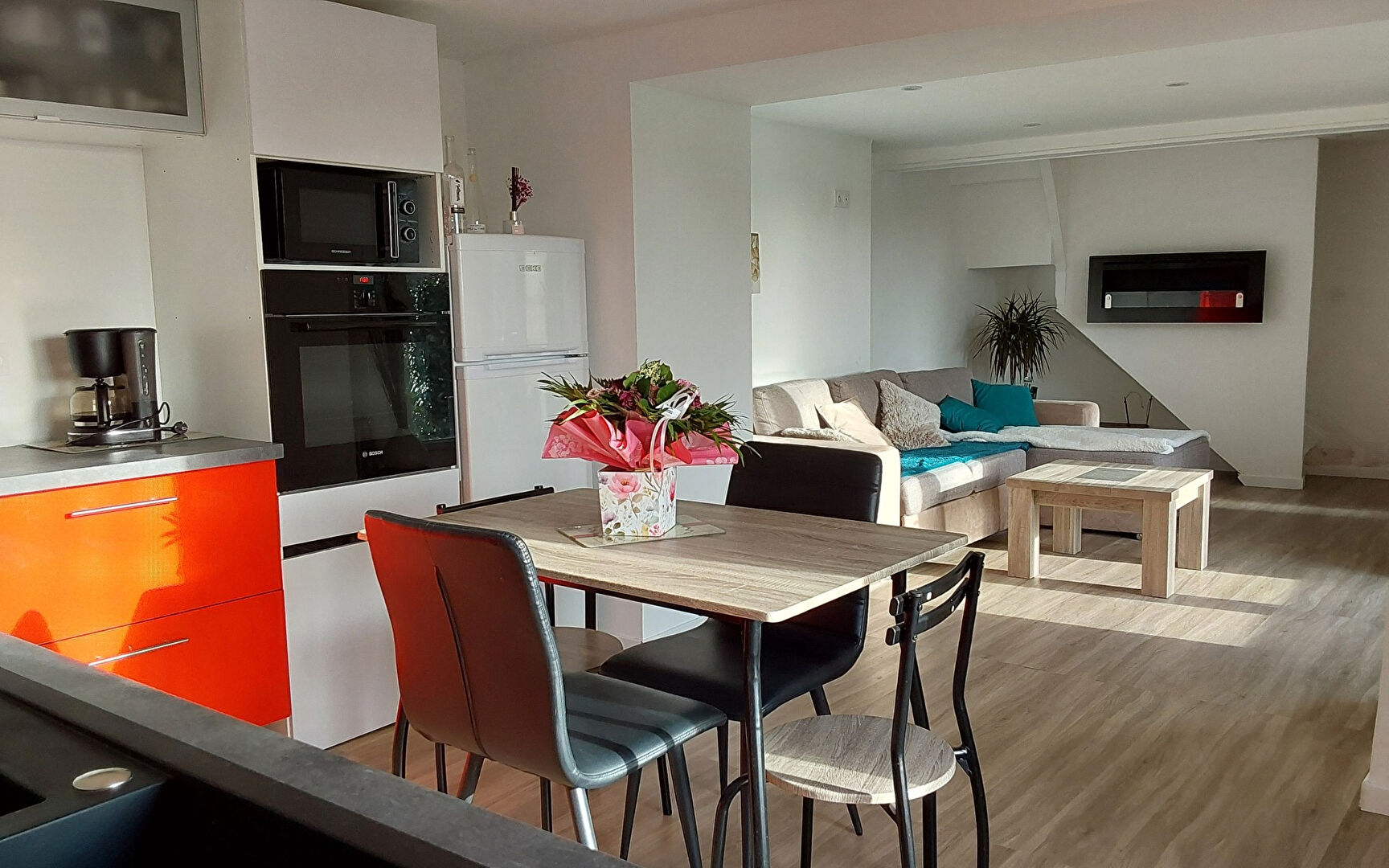Elle se compose d'une cuisine aménagée ouverte, un salon lumineux exposé sud-ouest avec cheminée bio-éthanol, 3 chambres dont une en RDC, une sal...