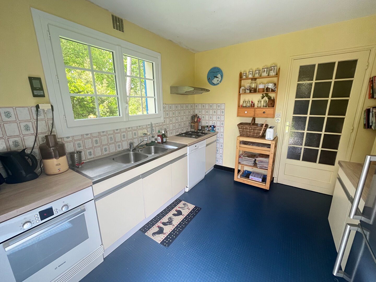 Entrée, cuisine séparée indépendante, pièce de vie avec poële à bois, salon.