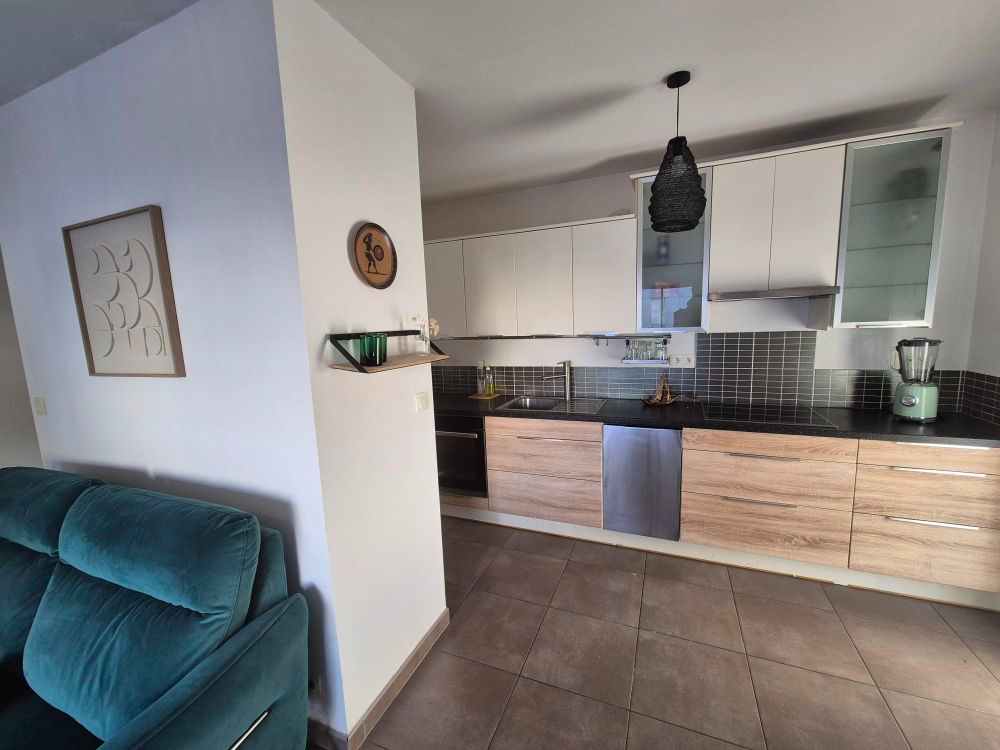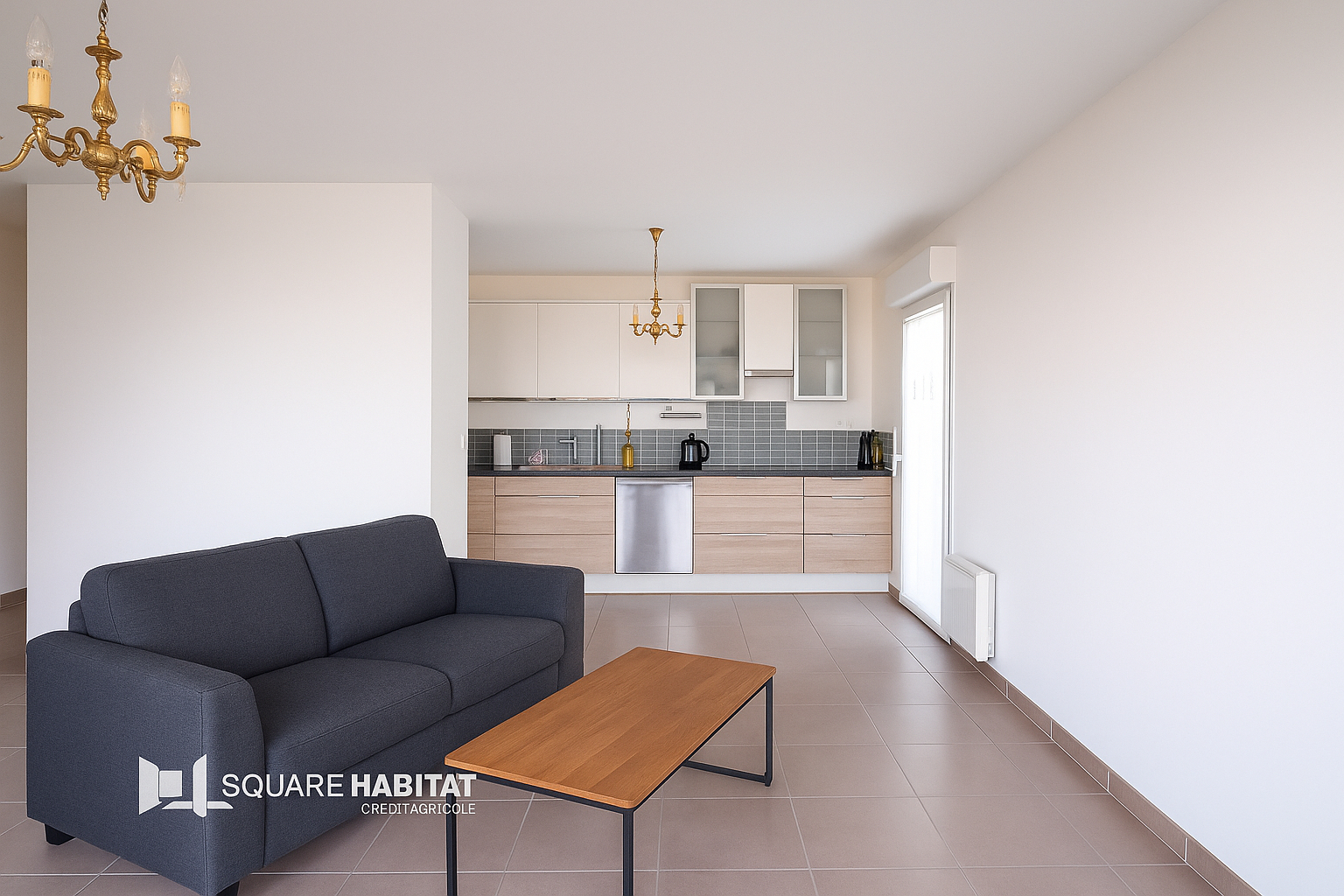 Une grande pièce de vie avec balcon plein sud, vue sur l'estuaire. cuisine indépendante aménagée et équipée.