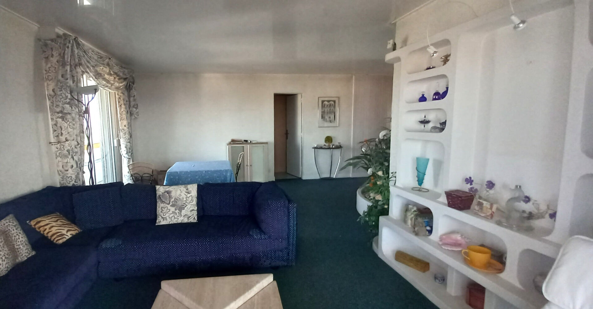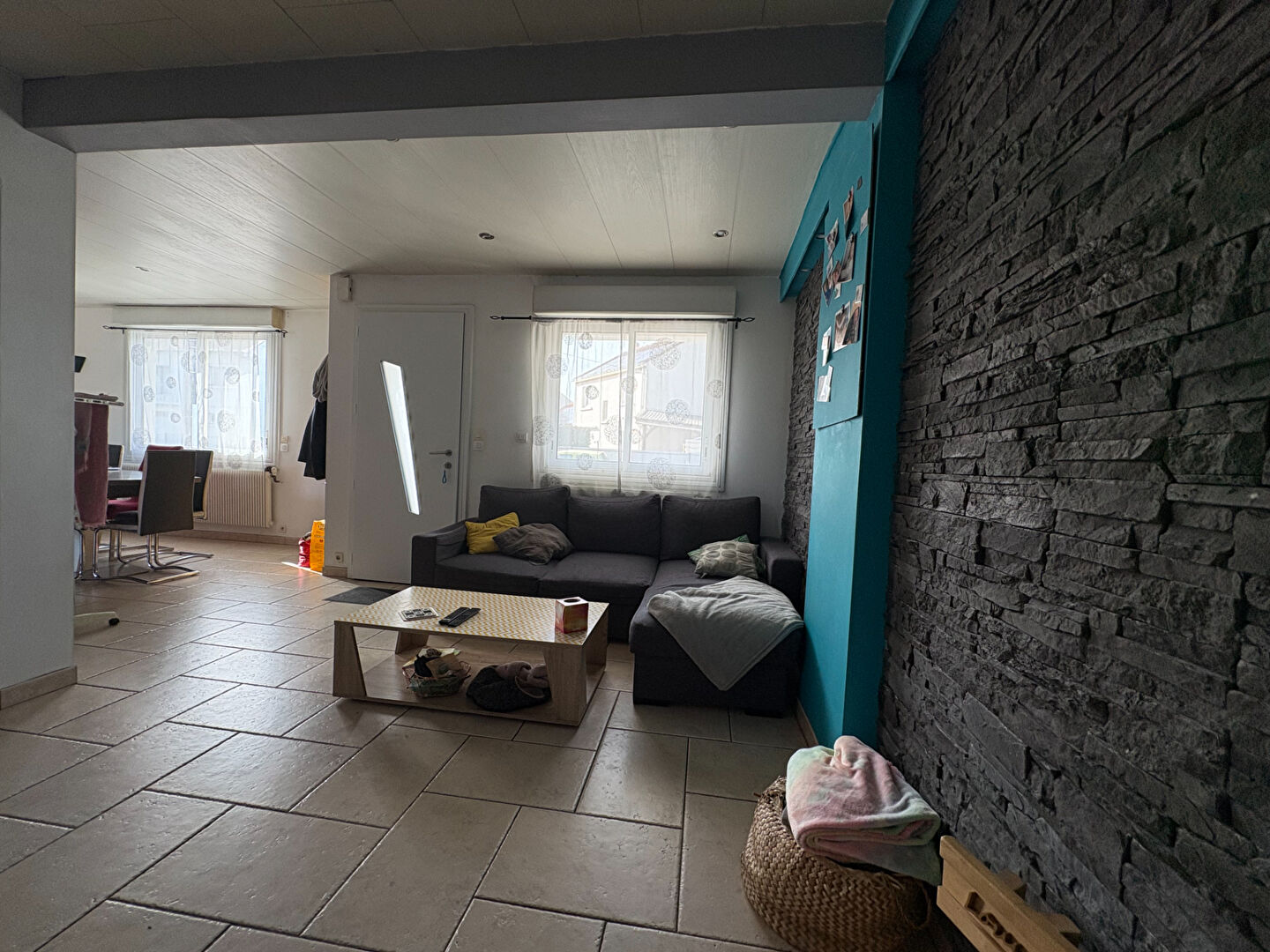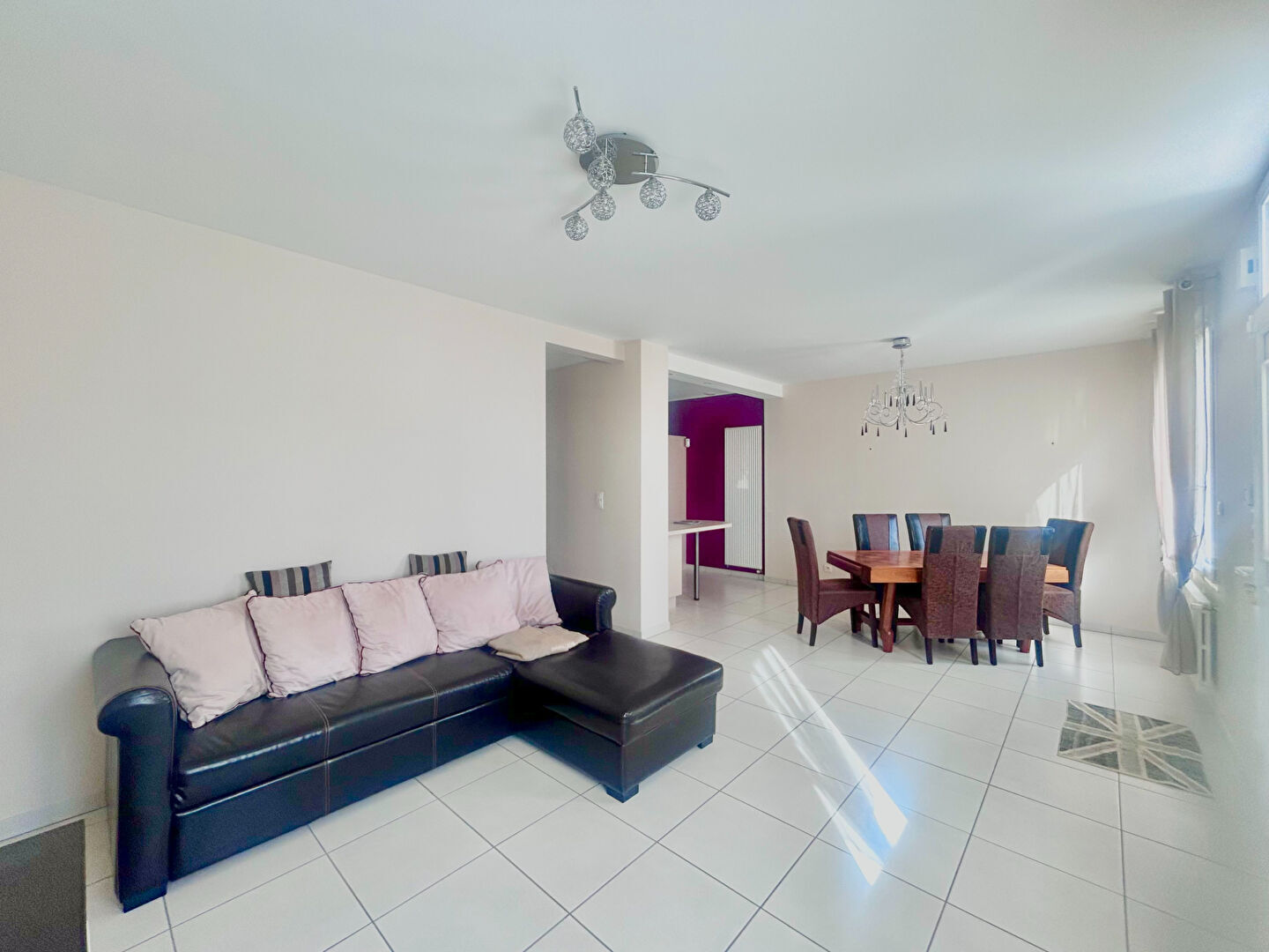 Vaste séjour traversant avec cuisine ouverte équipée.