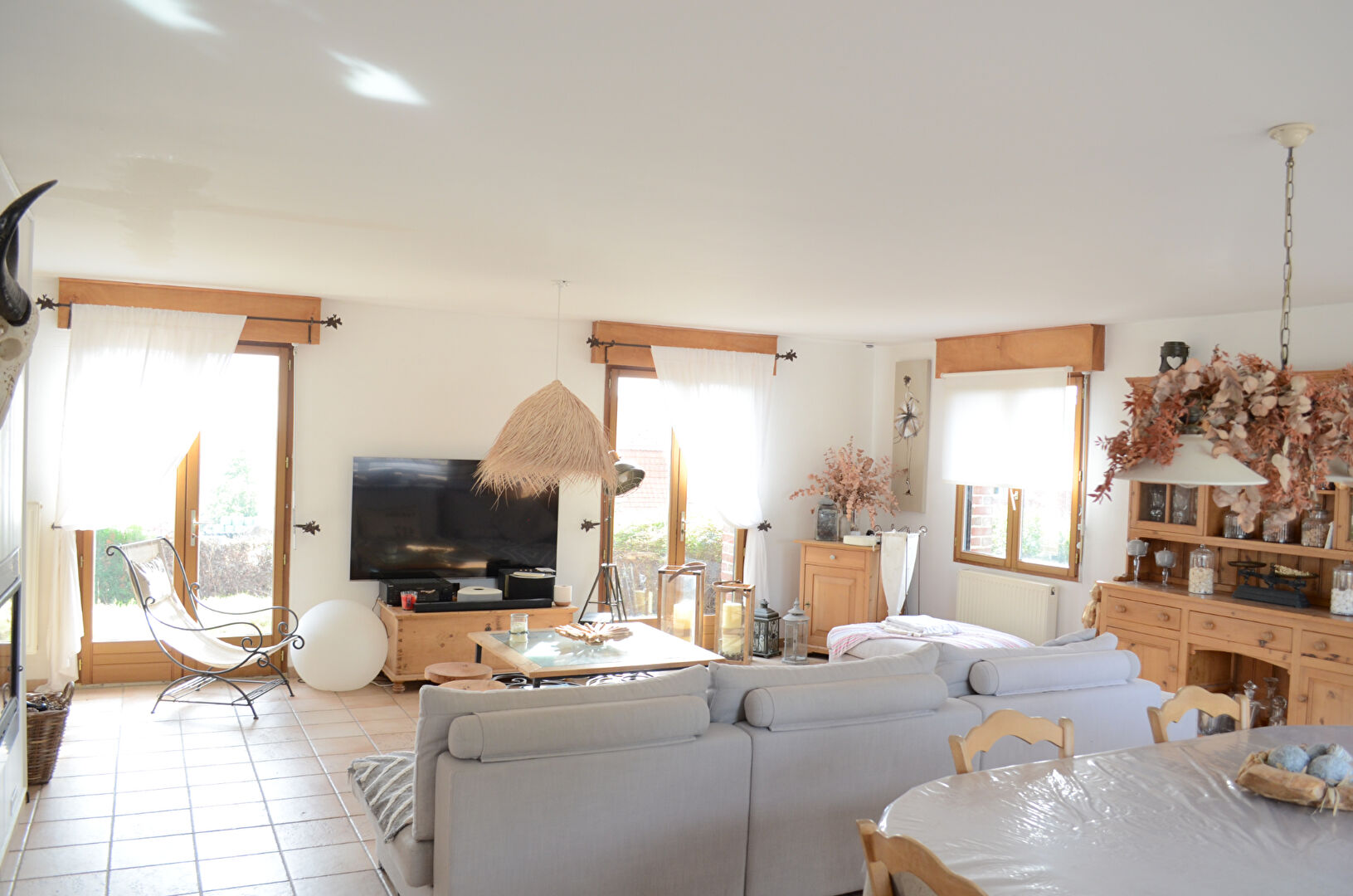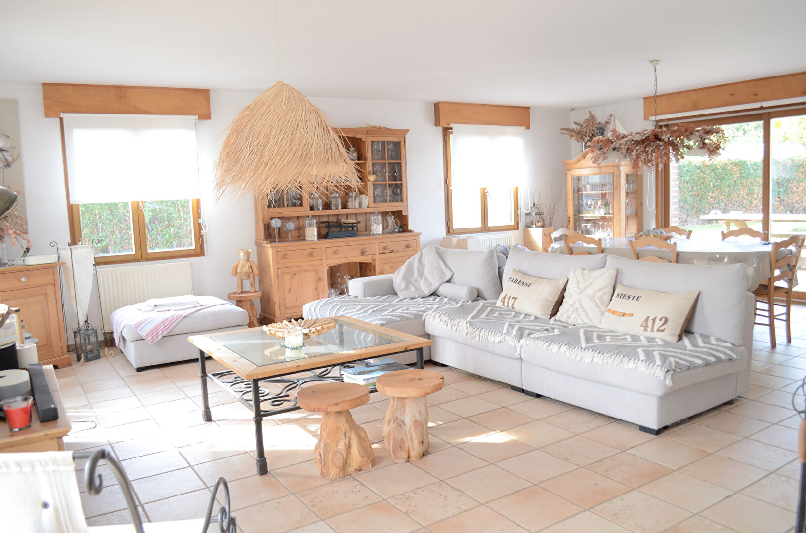 Un magnifique plain pied ! comprenant un très grand séjour traversant et baigné de lumière. Il donne sur la cuisine et sur la terrasse attenant à la piscine.
