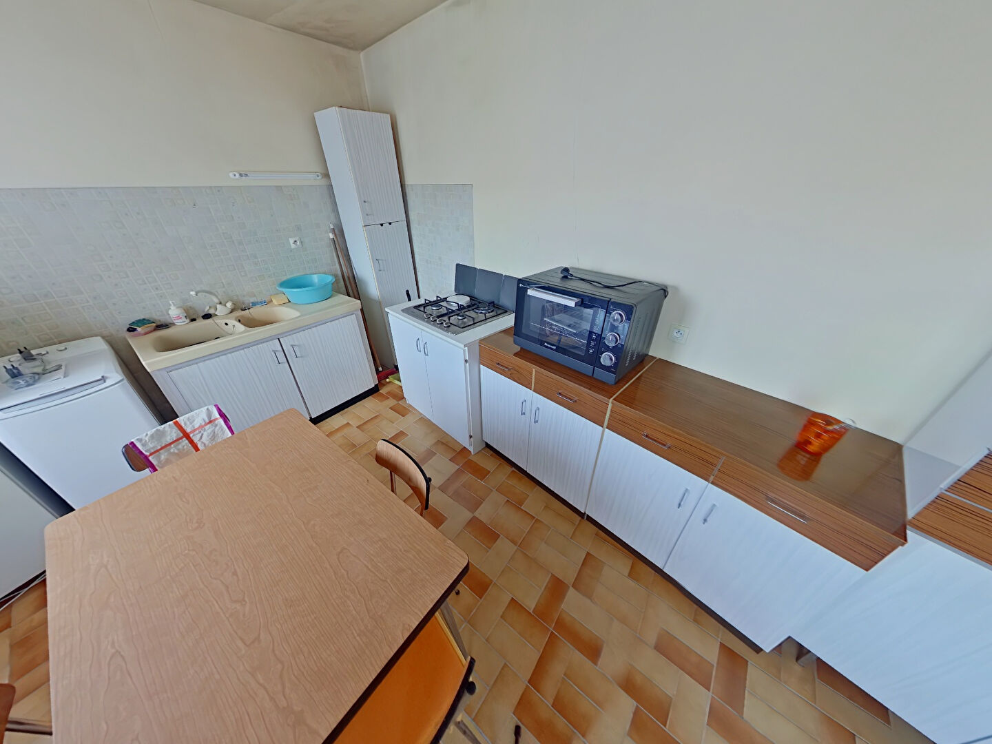 Un grand salon séjour avec cuisine ouverte, 3 chambres, une salle d'eau, toilettes.