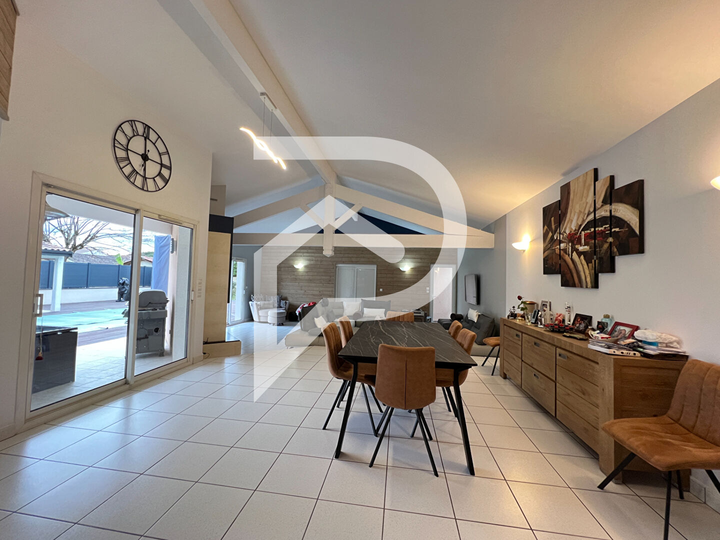 La pièce de vie vous accueille avec sa charpente apparente et une belle luminosité tout au long de la journée grâce...