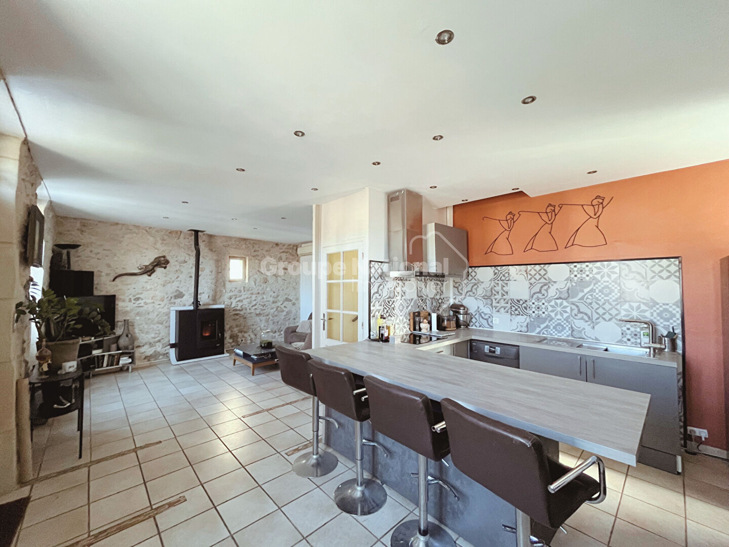 Grande pièce à vivre lumineuse avec cuisine entièrement équipée, poêle à granulés et climatisation réversible.